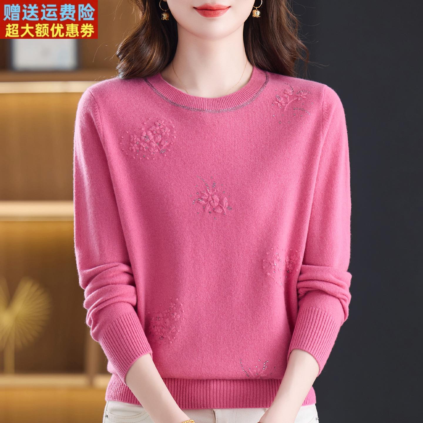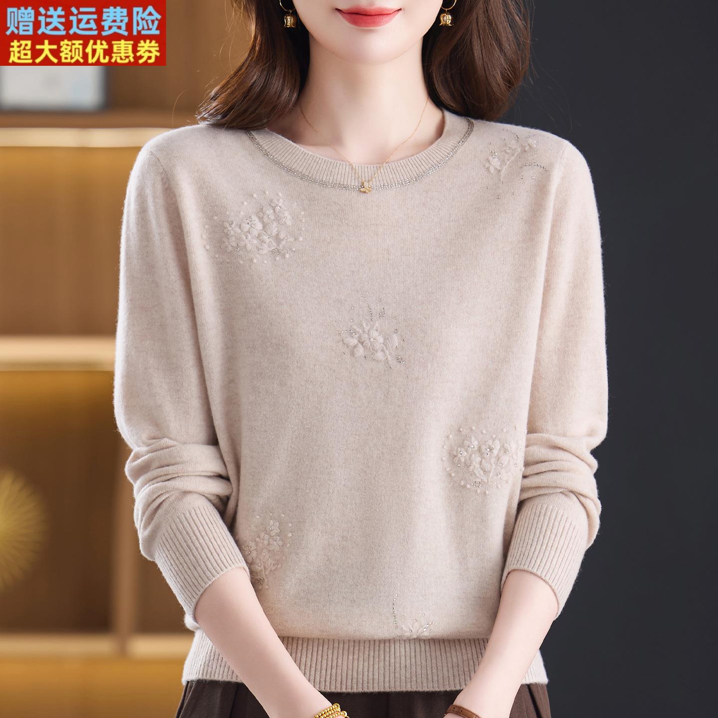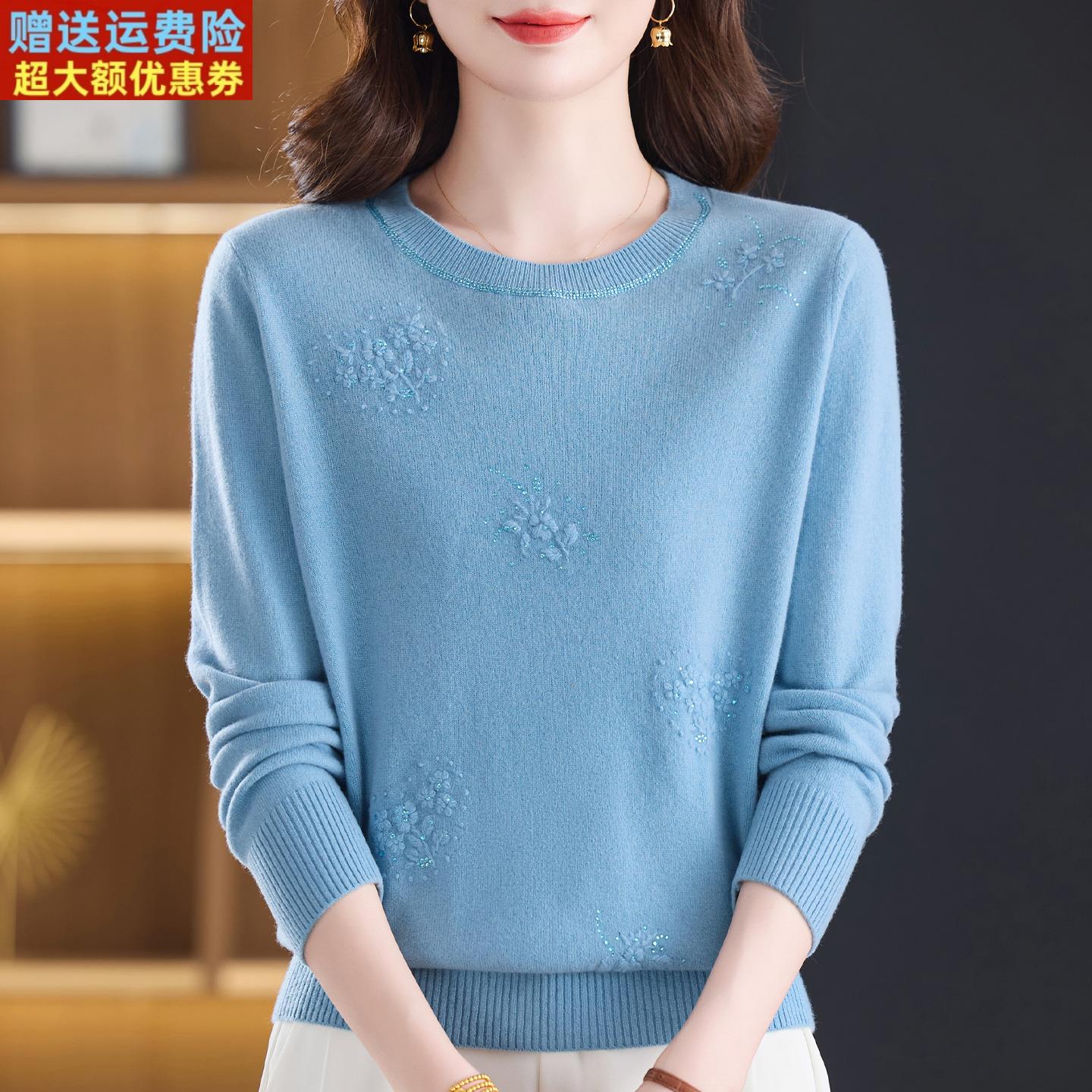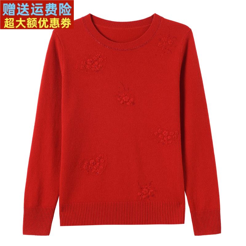 洋气妈妈装春秋毛衣圆领中年妇女100%羊毛衫中老年女秋冬打底衣服
