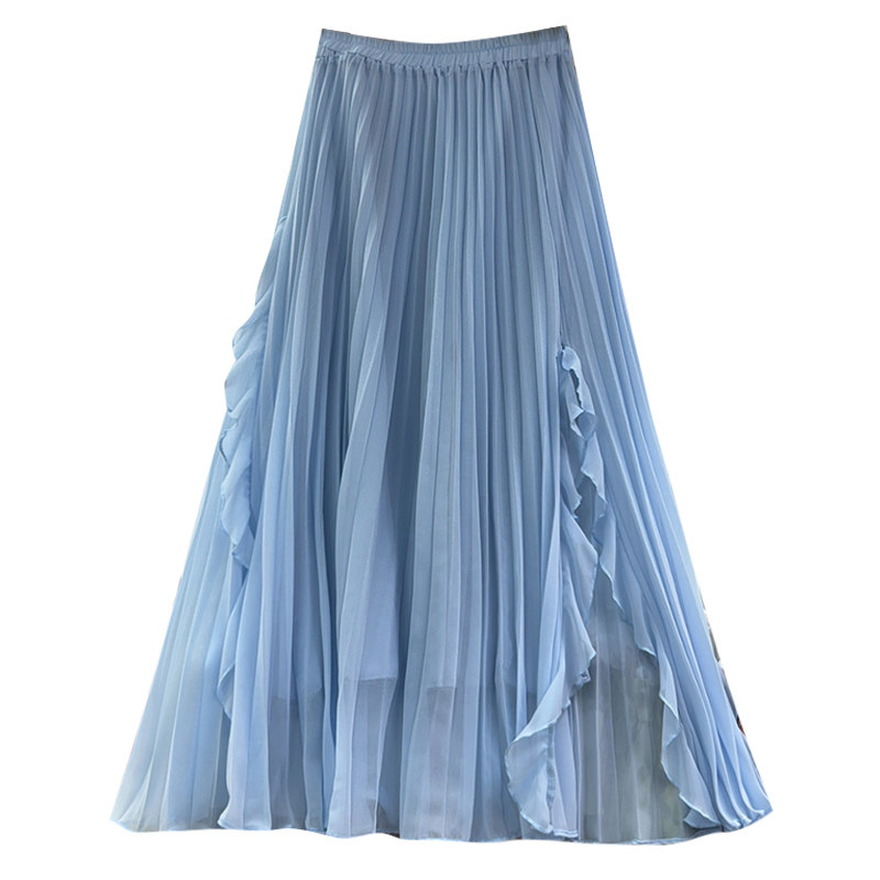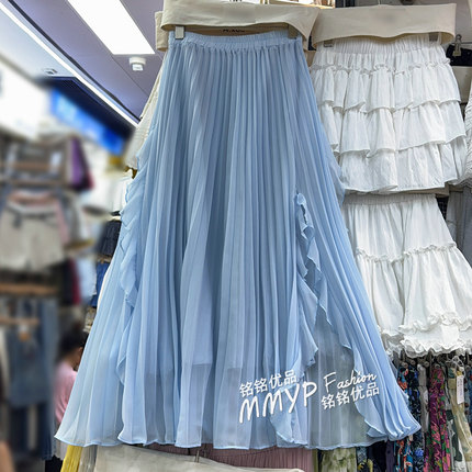 夏季垂感长款大摆荷叶边开叉雪纺半身裙女2025新款a字百褶长裙子