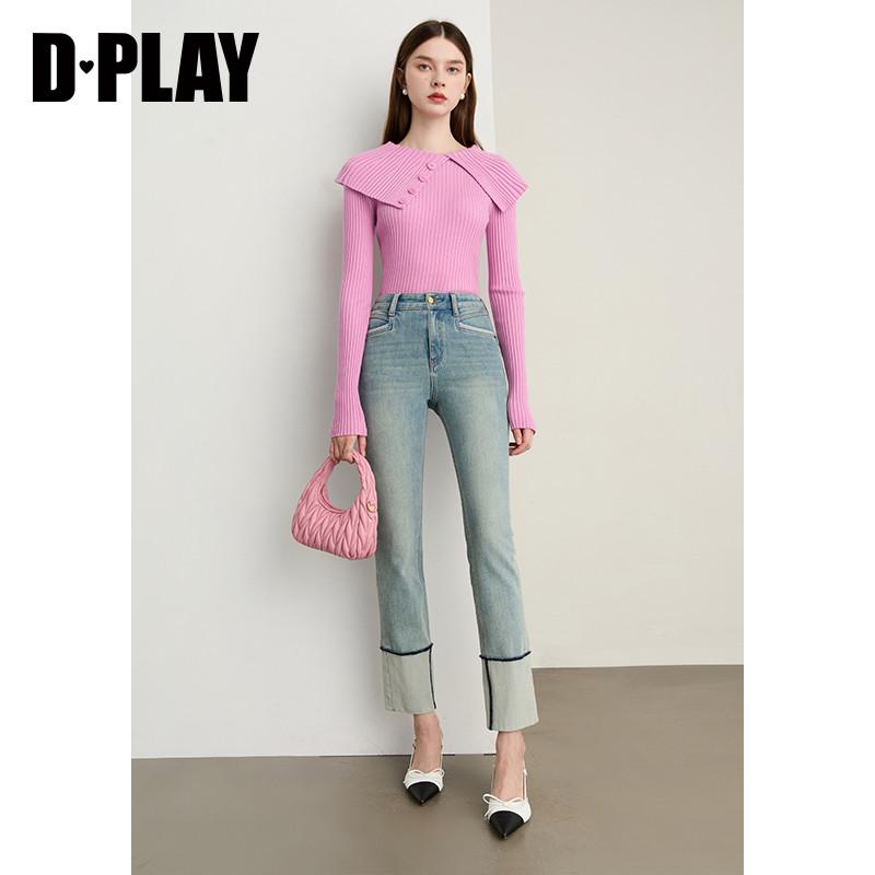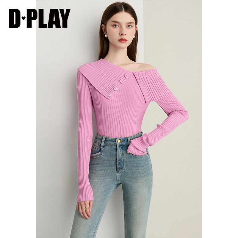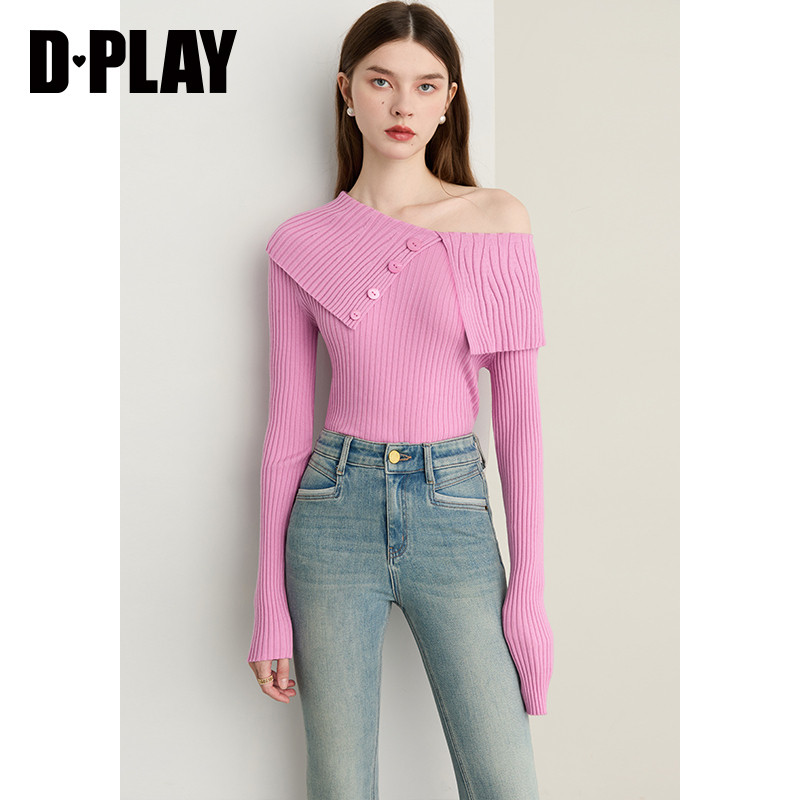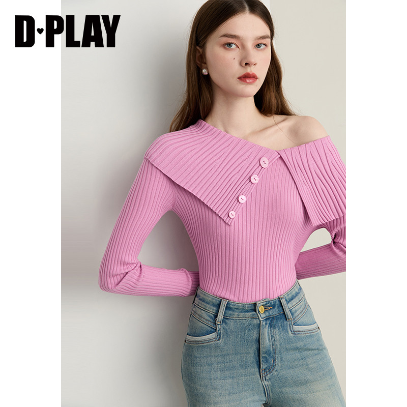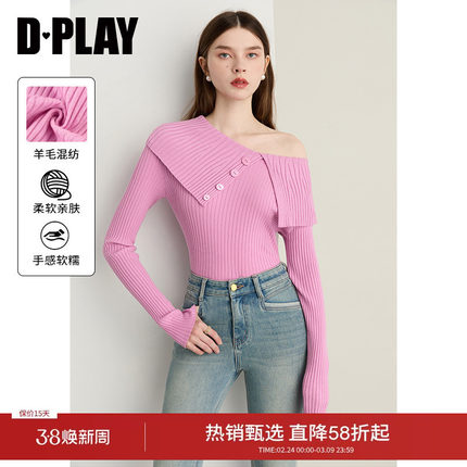DPLAY【云朵针织系列】年秋季新款粉色含羊毛女一字领针织衫