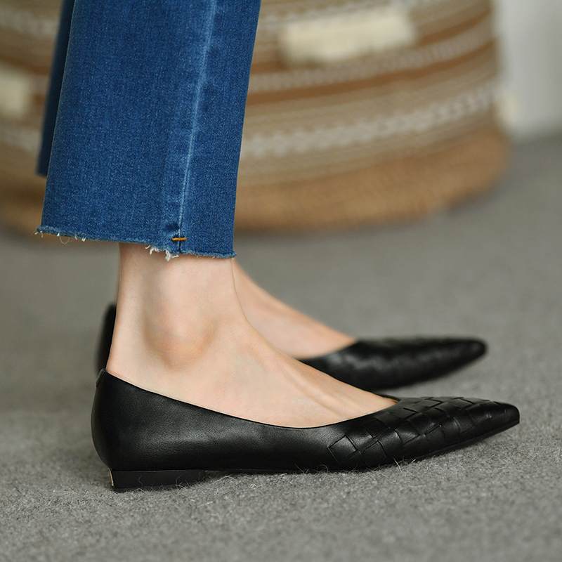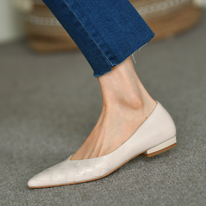 皮厚先生 低跟尖头平底鞋女 米白色真皮浅口单鞋2024春季新款女鞋