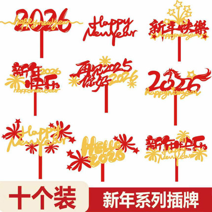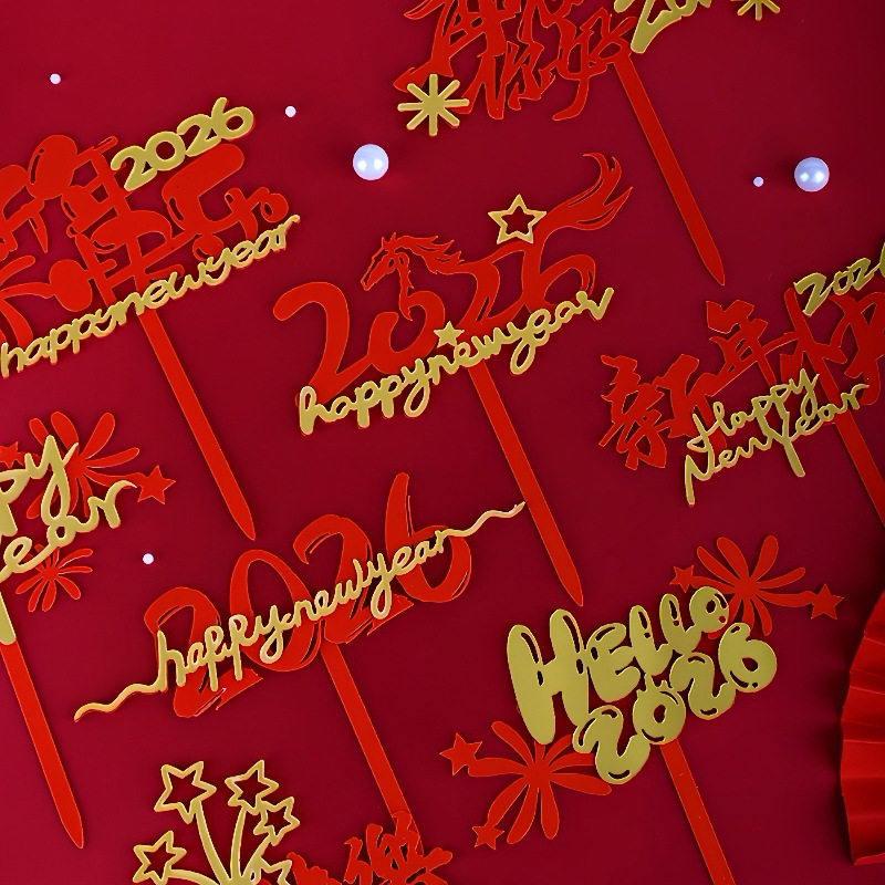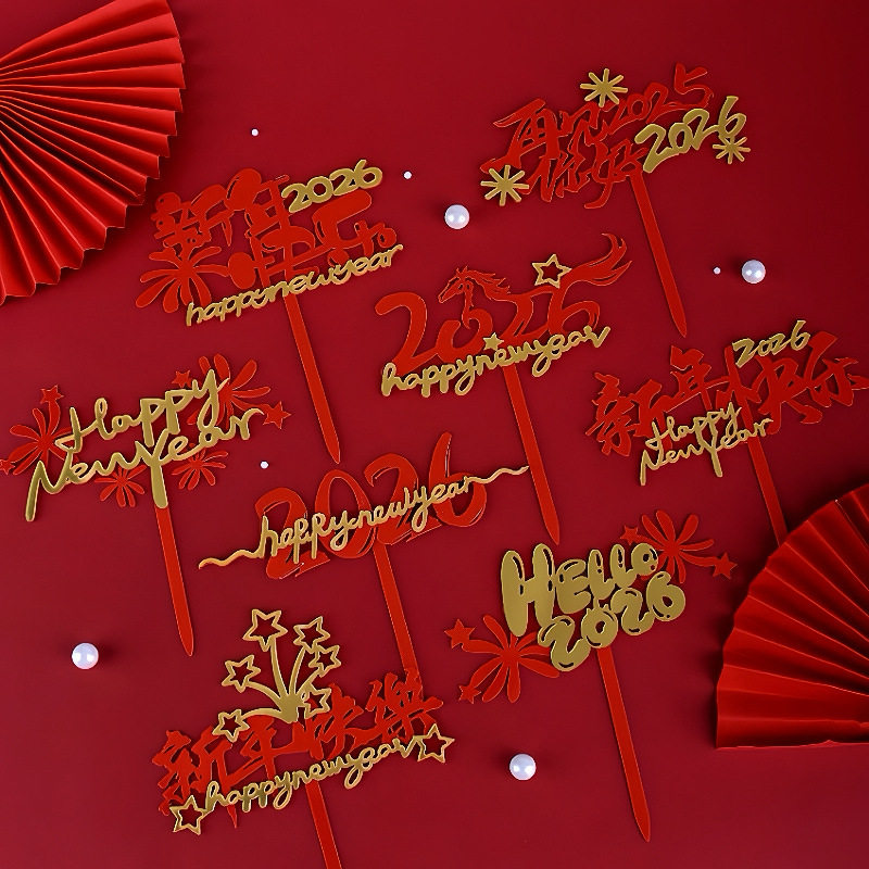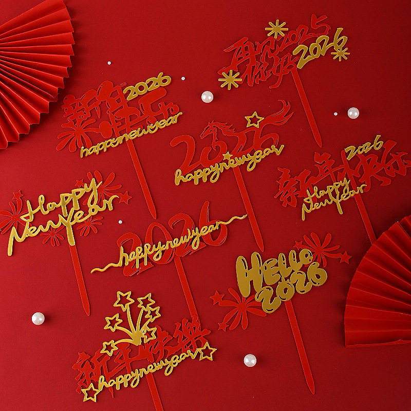 包邮2026马年新年蛋糕装饰插牌元旦新春红金卡通亚克力插件
