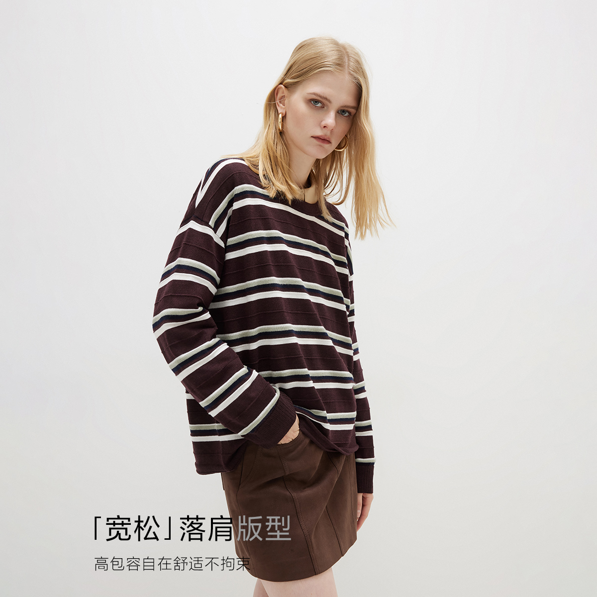 ONLY2025冬季新款学院风圆领落肩撞色条纹宽松舒适长袖针织衫女