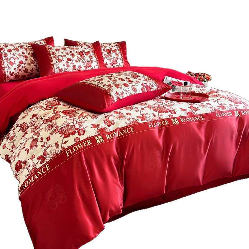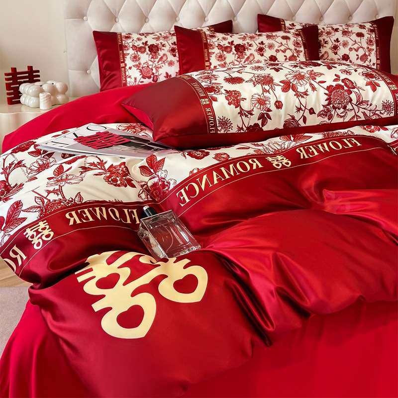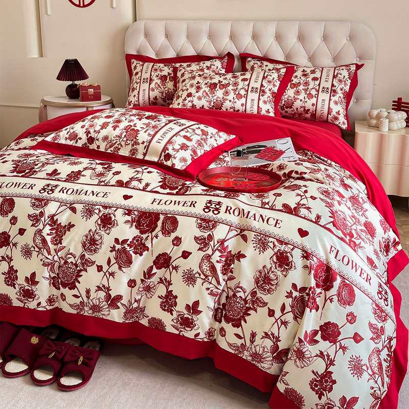 轻奢水洗亲肤棉高级感印花婚庆四件套红色床单被套婚床陪嫁结婚