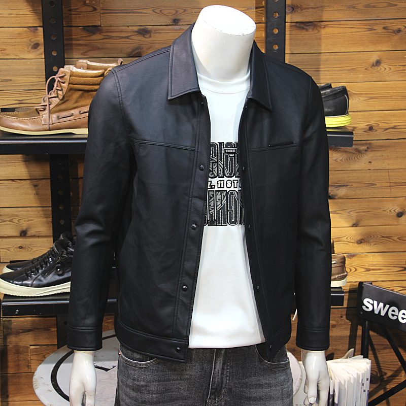 秋装男士翻领皮衣简约分割口袋修身休闲青年休闲简欧轻奢皮夹克