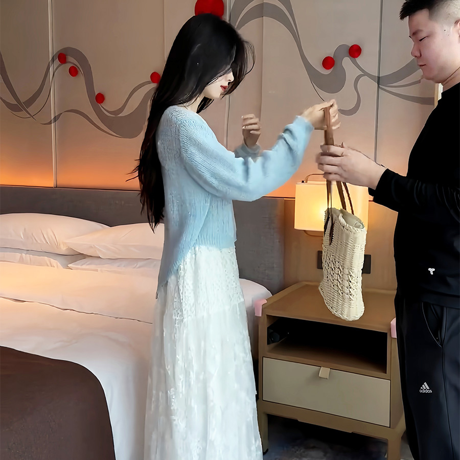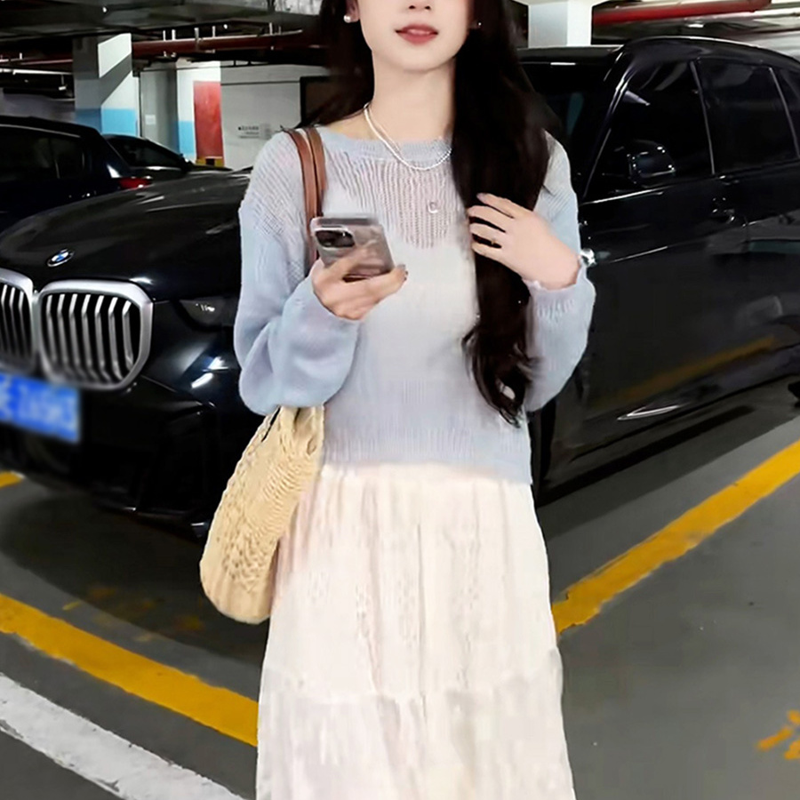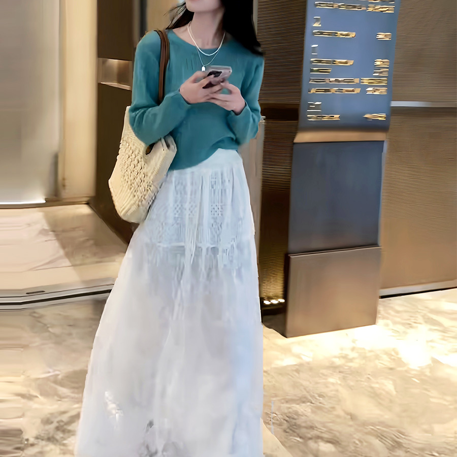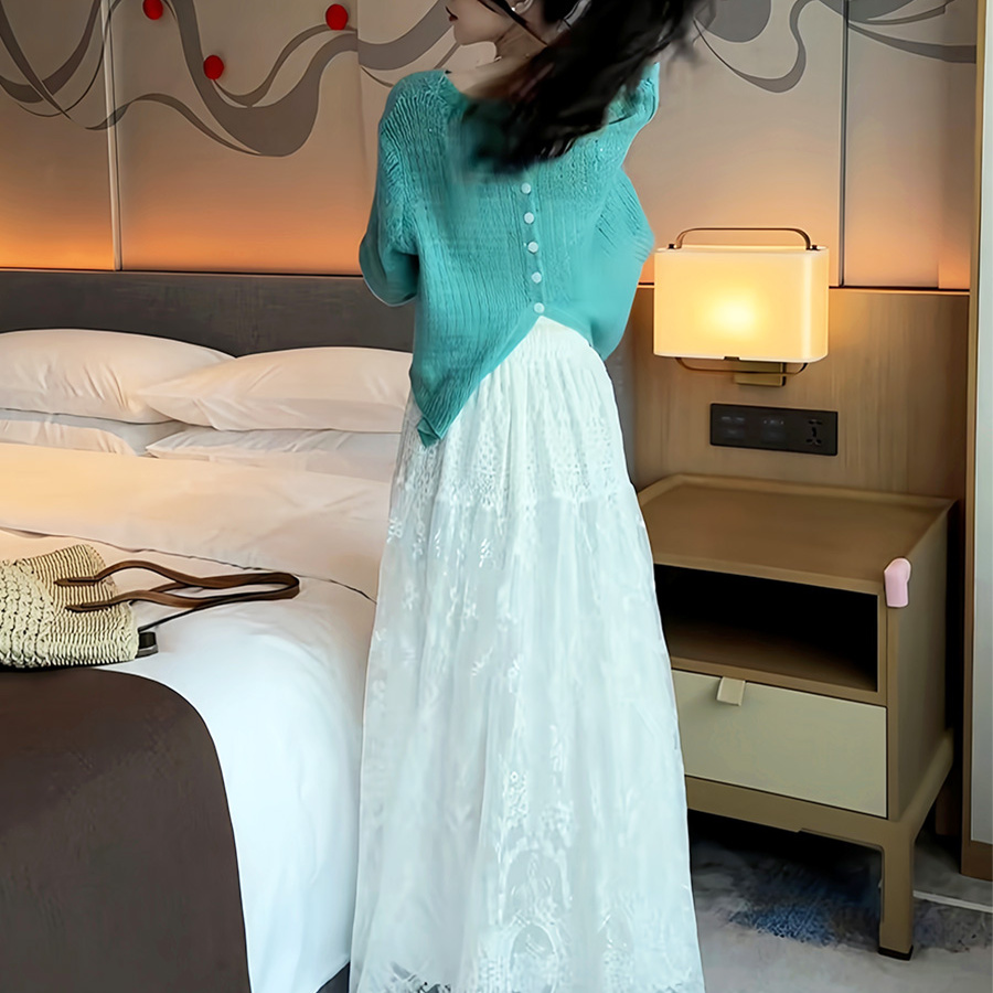 后背纽扣薄款针织衫蕾丝半身裙套装女气质时尚亮丝长袖罩衫一整套