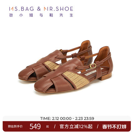 包小姐与鞋先生夏季学院棕拉菲草编平底半凉鞋女251097