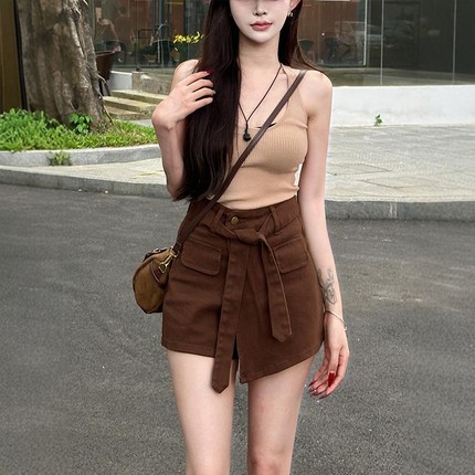 李李服饰咖色牛仔短裤女2026春季新款不规则高腰显瘦包臀短裤裙