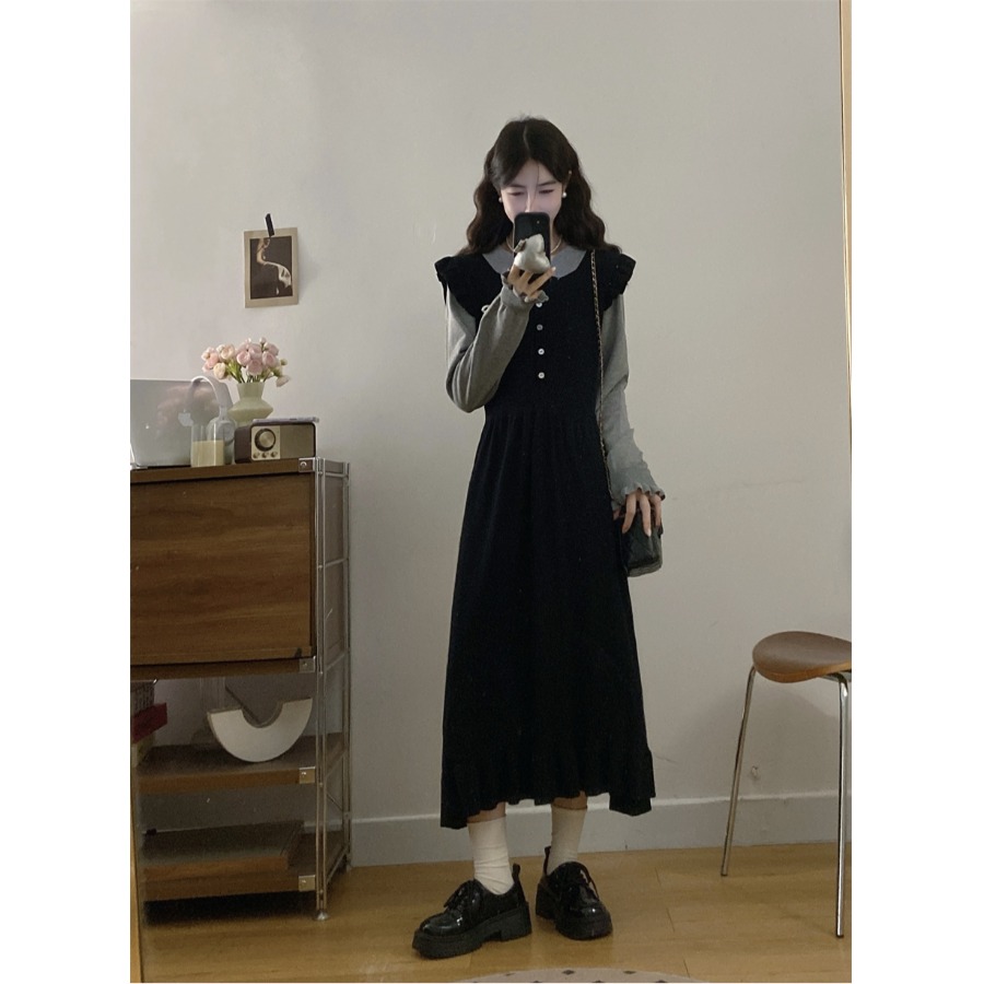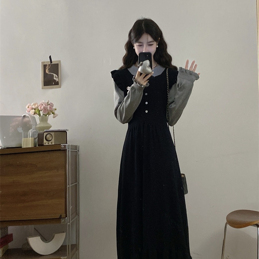 大码胖mm法式假两件拼接连衣裙女秋冬气质收腰显瘦长袖打底针织裙