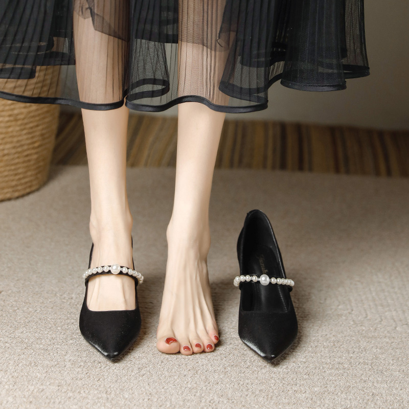 一字带尖头细跟珍珠高跟鞋女