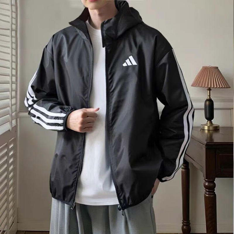 阿迪达斯男装春秋款休闲套装黑色梭织连帽夹克长裤子25新款运动服