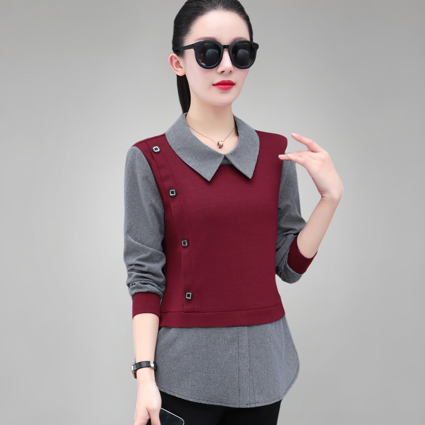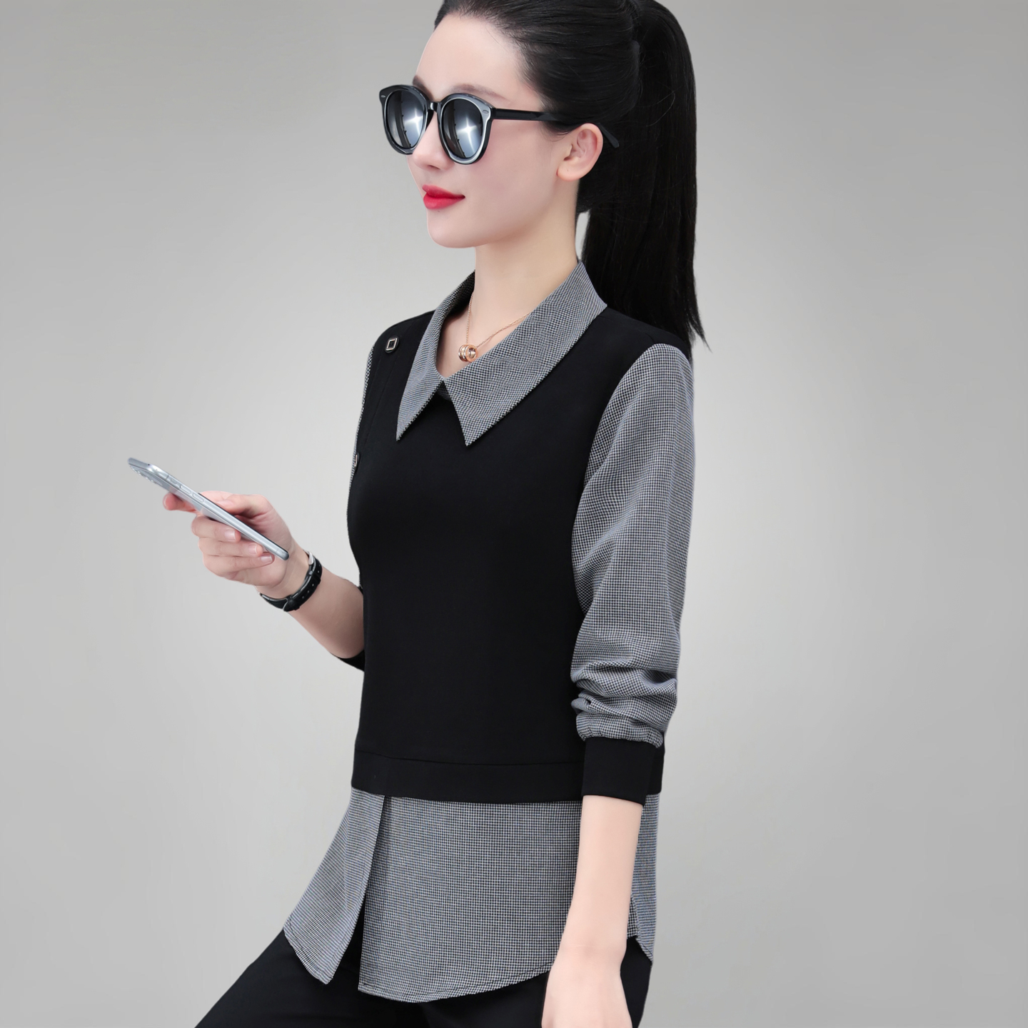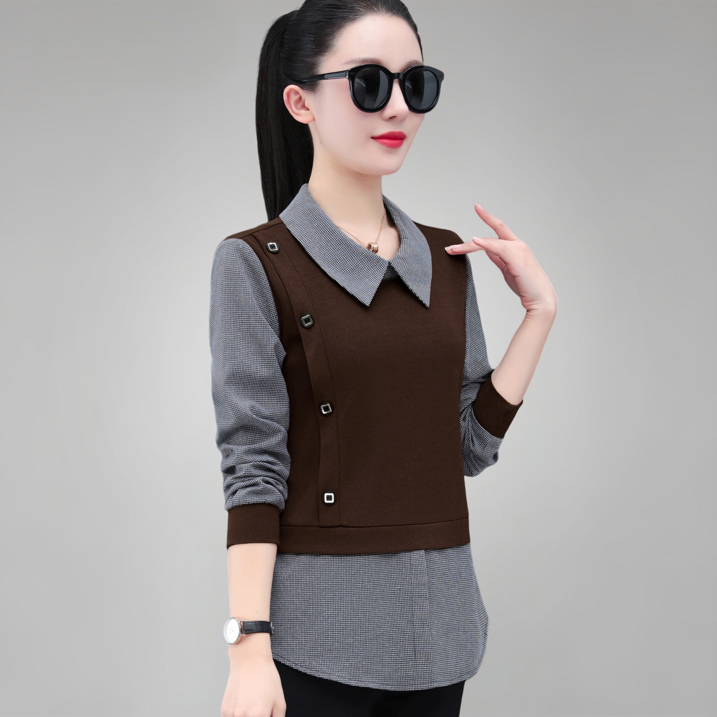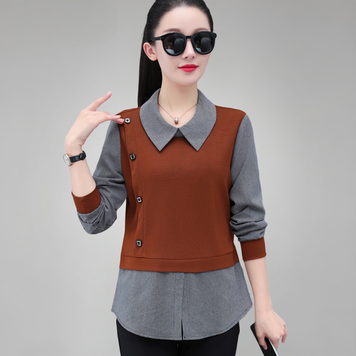 女士衬衫假两件妈妈洋气长袖上衣