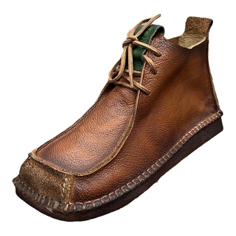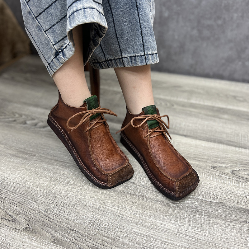 艺鞜2026年秋季新款真皮系带方头短靴休闲妈妈平底马丁靴女