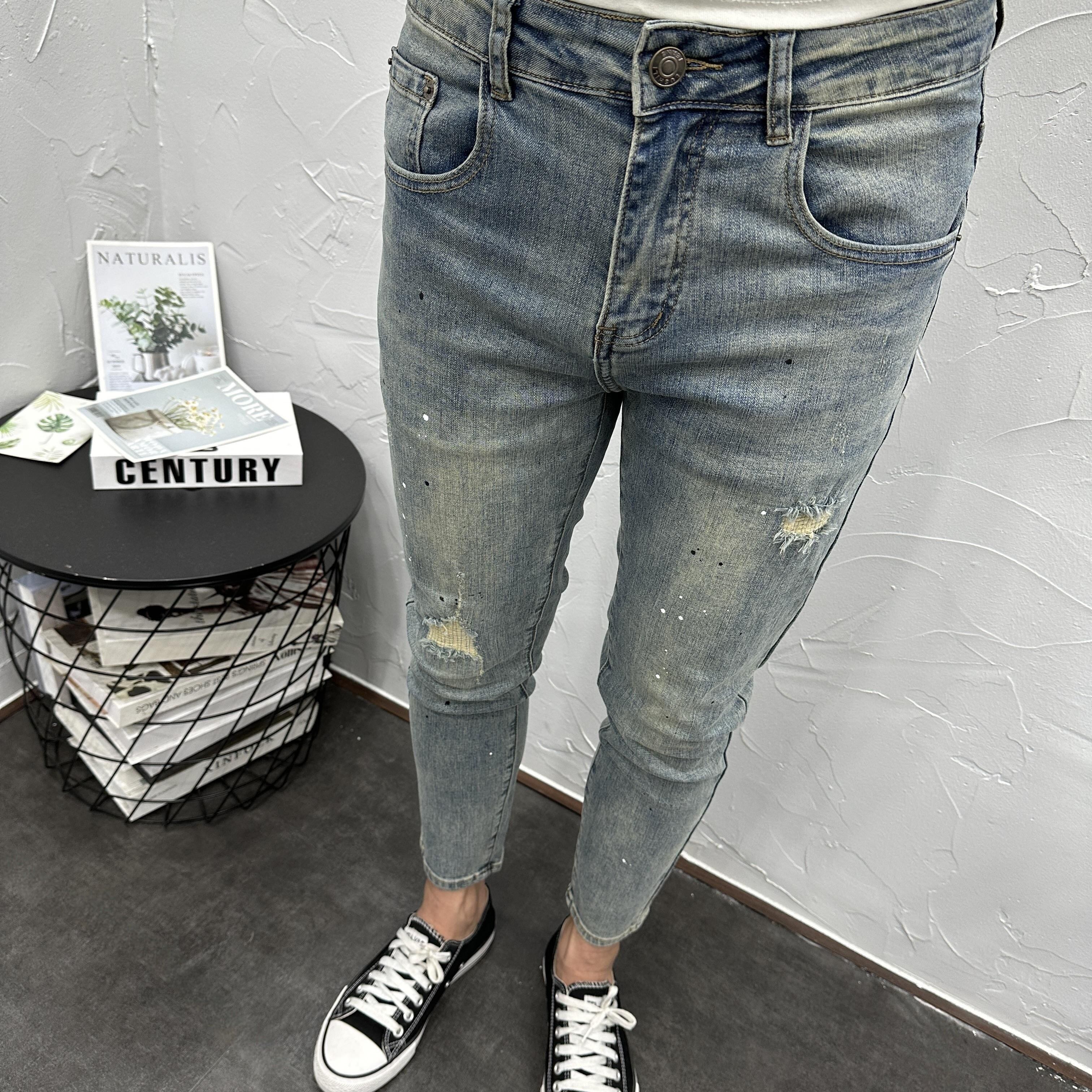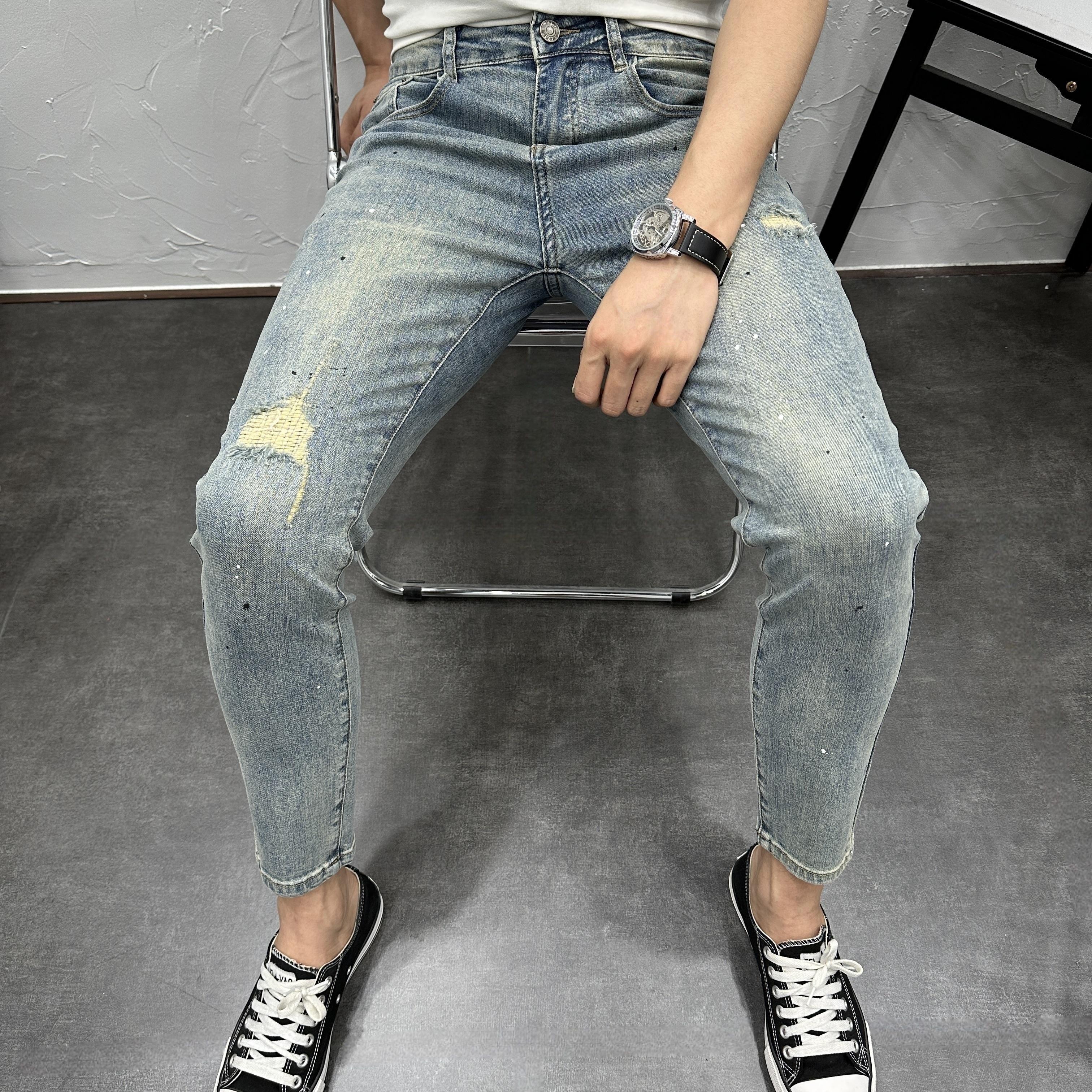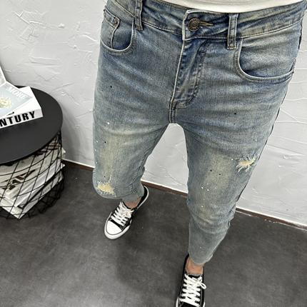 甩漆破洞做旧蓝水洗弹力修身小脚九分牛仔裤男夏秋新潮流休闲百搭