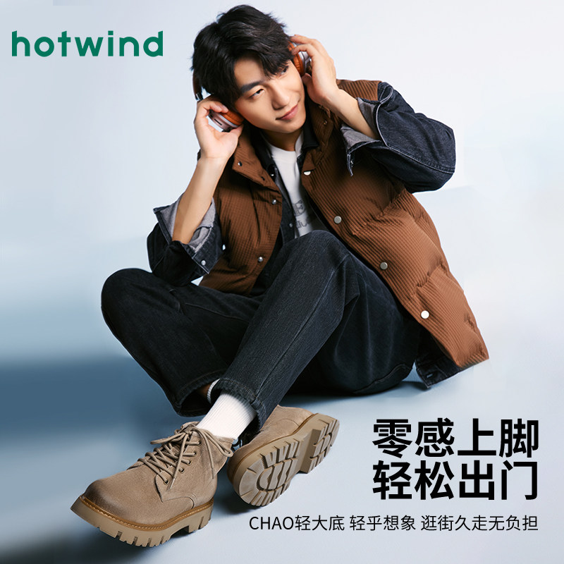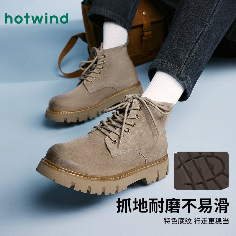 热风男鞋秋季新款男士靴子时尚马丁靴圆头系带英伦复古短筒靴