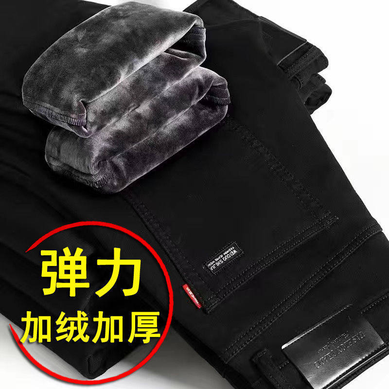 秋冬季牛仔男士加绒加厚宽松直筒修身弹力工装工作耐磨劳保长裤子