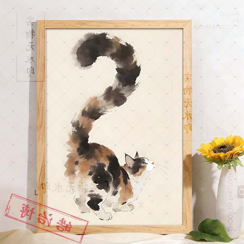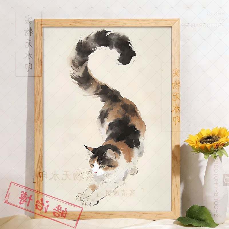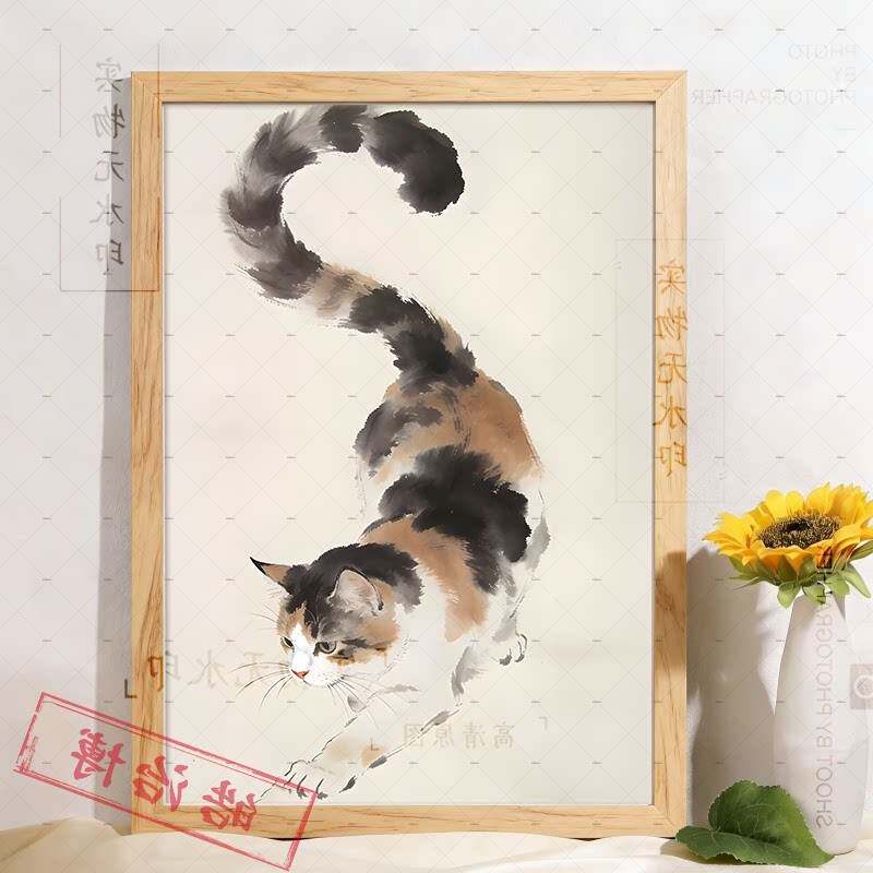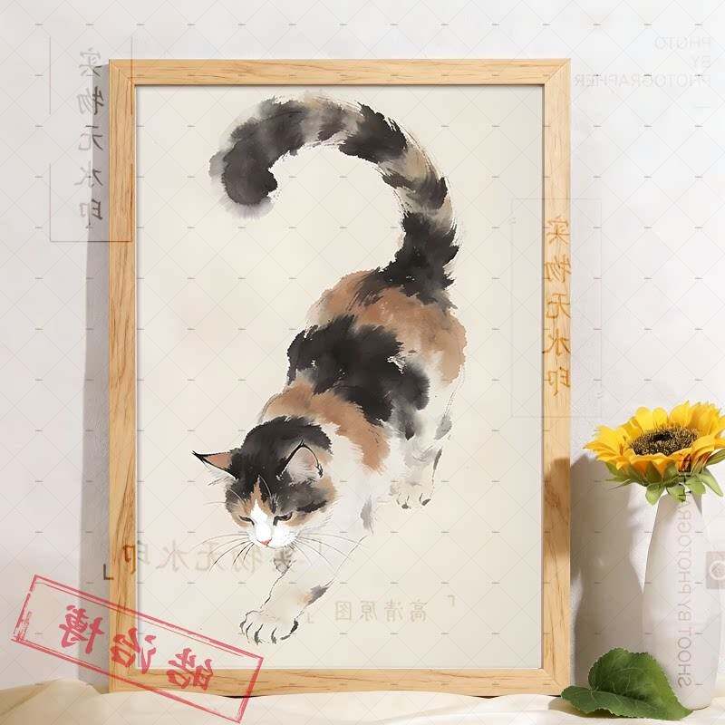三花猫可爱中国水墨画风格猫中刘亦菲家居装饰可挂相框摆台礼物