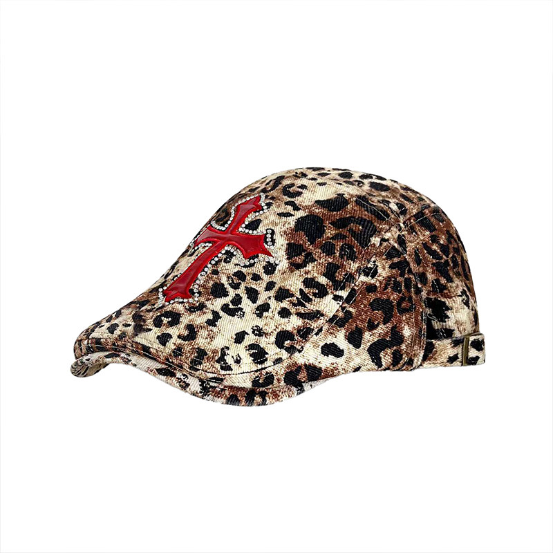 美式复古豹纹十字架前进帽女春夏季潮流时髦甜酷百搭显脸小贝雷帽