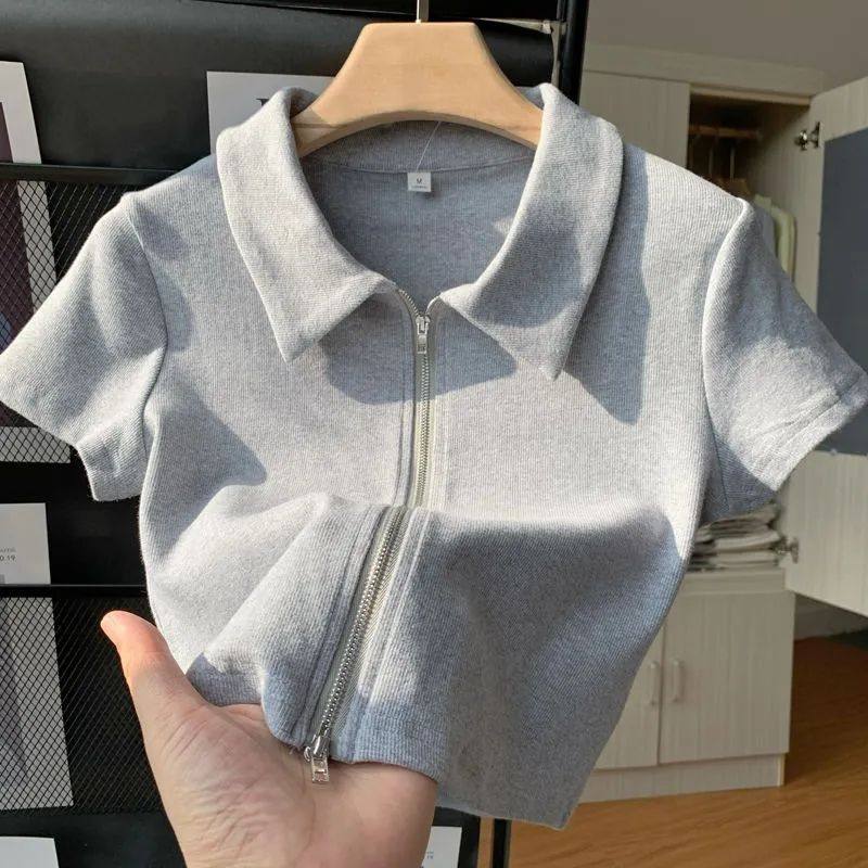 2024新款纯色polo翻领短袖T恤女夏季设计感双拉链修身短款打底衫