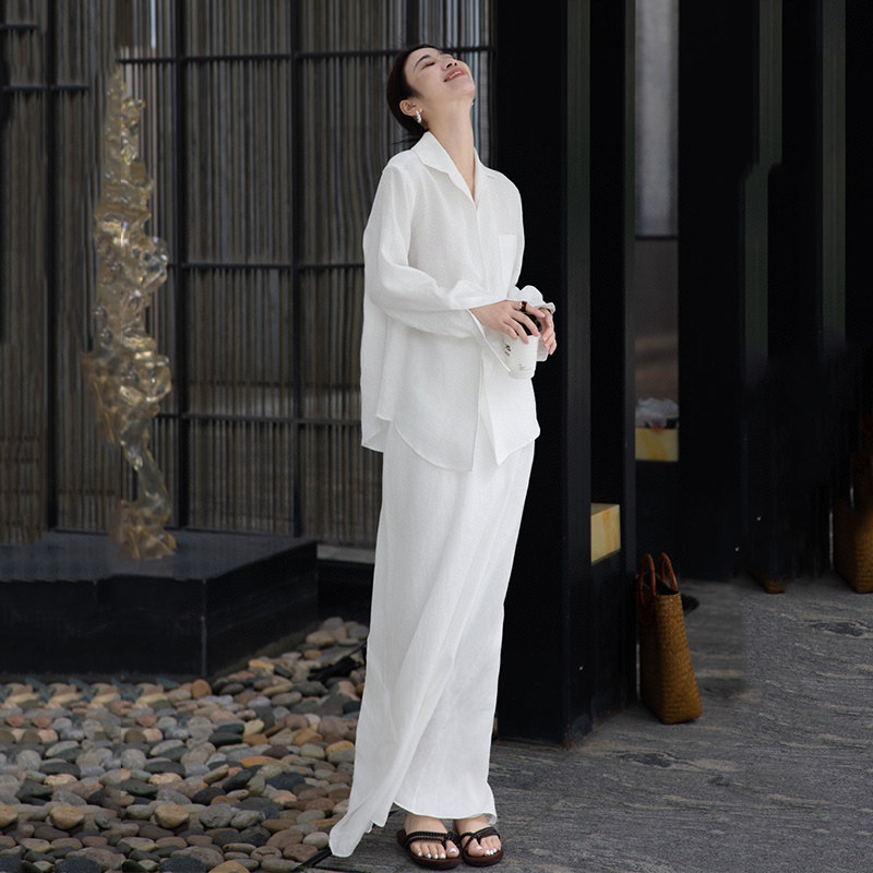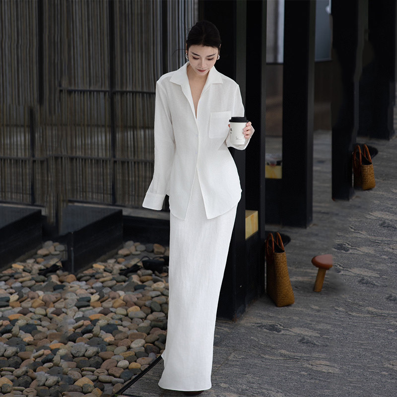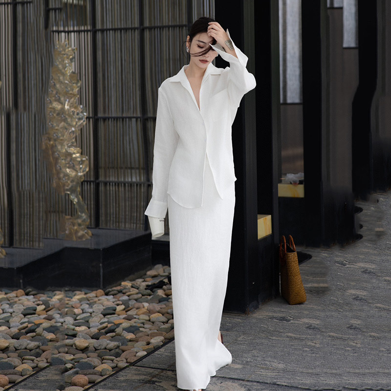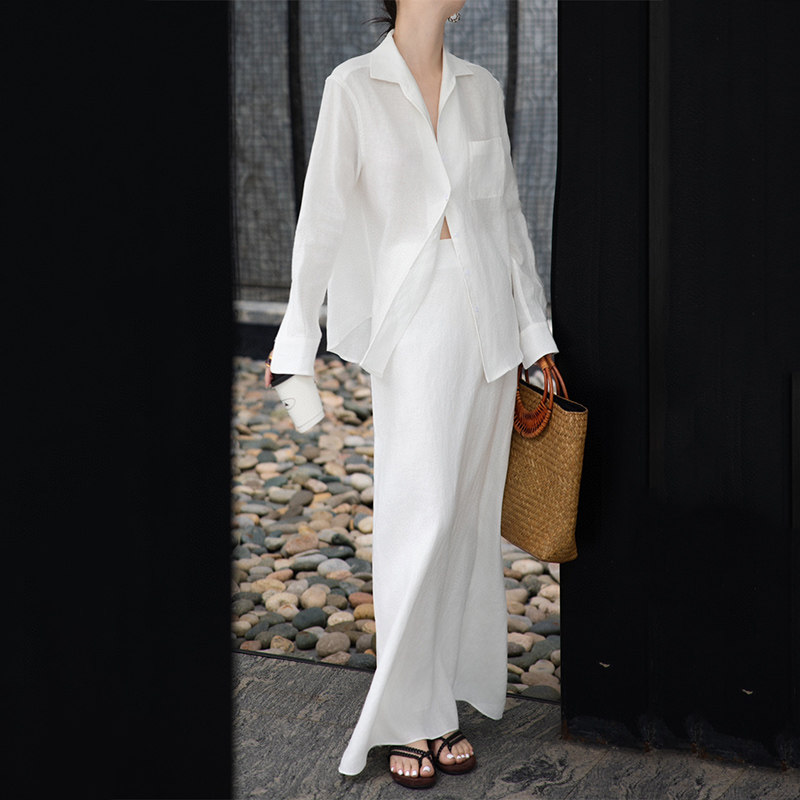 老钱风松弛感100%纯天然亚麻套装裙夏季薄款长袖衬衫高腰鱼尾裙子