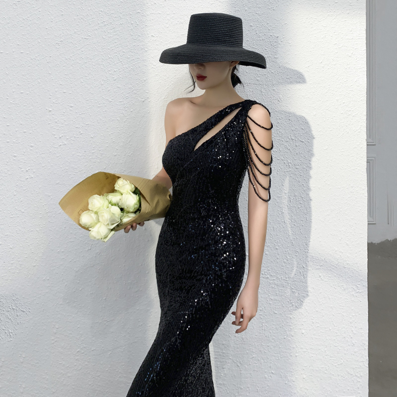 鱼尾晚礼服裙女轻奢小众高端黑色单肩连衣裙主持人女宴会气质重工