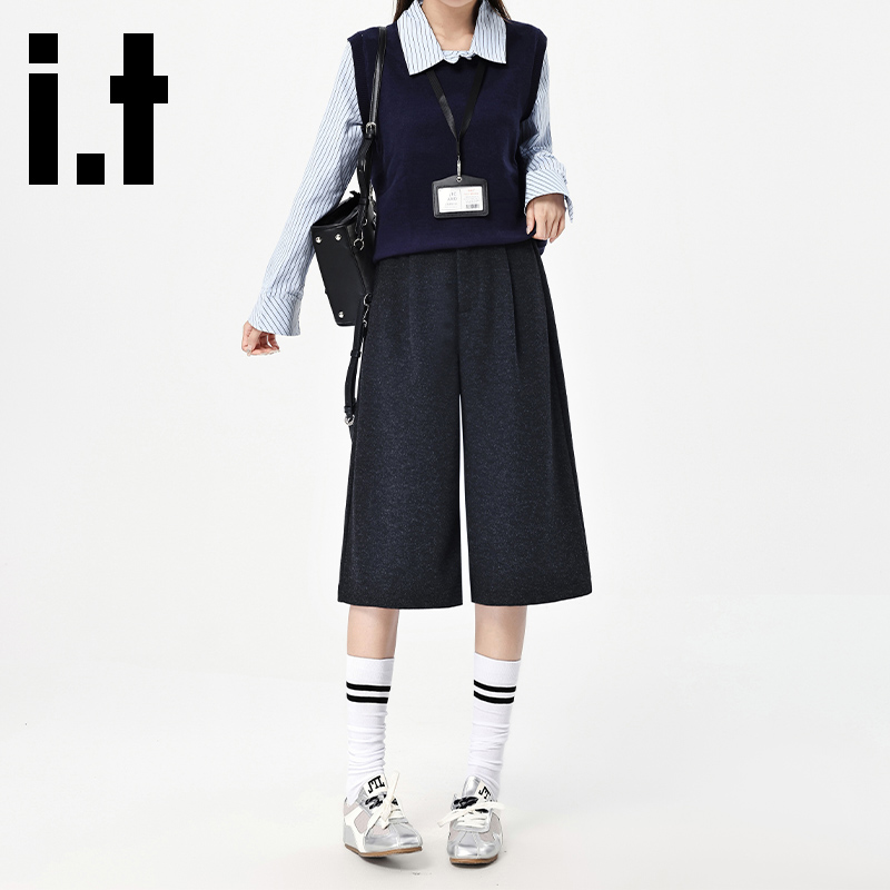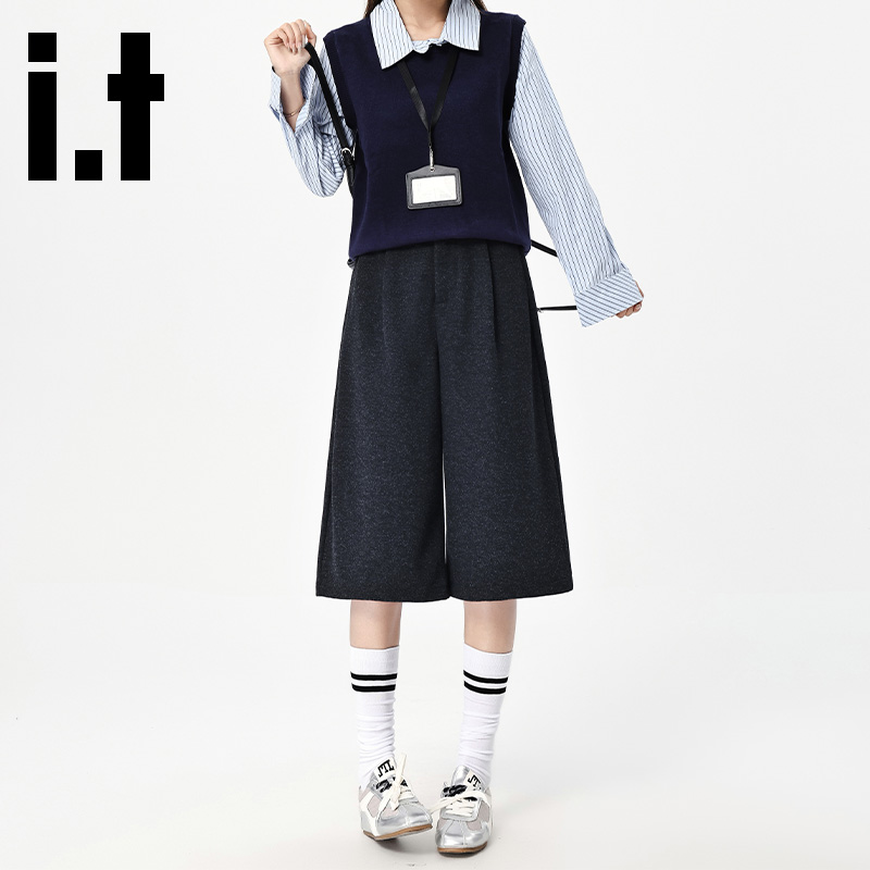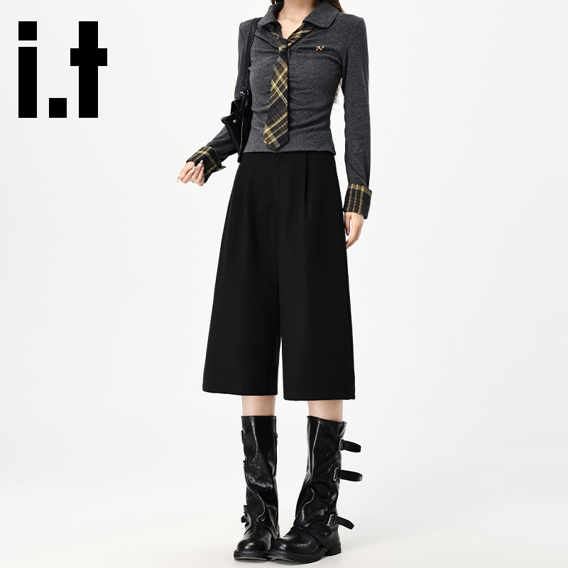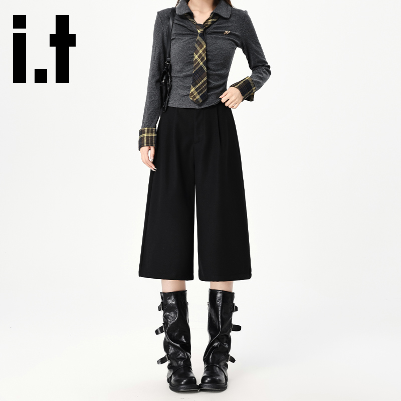 it:CHOCOOLATE灰色毛呢七分阔腿裤女秋高腰遮胯垂感休闲八分靴裤