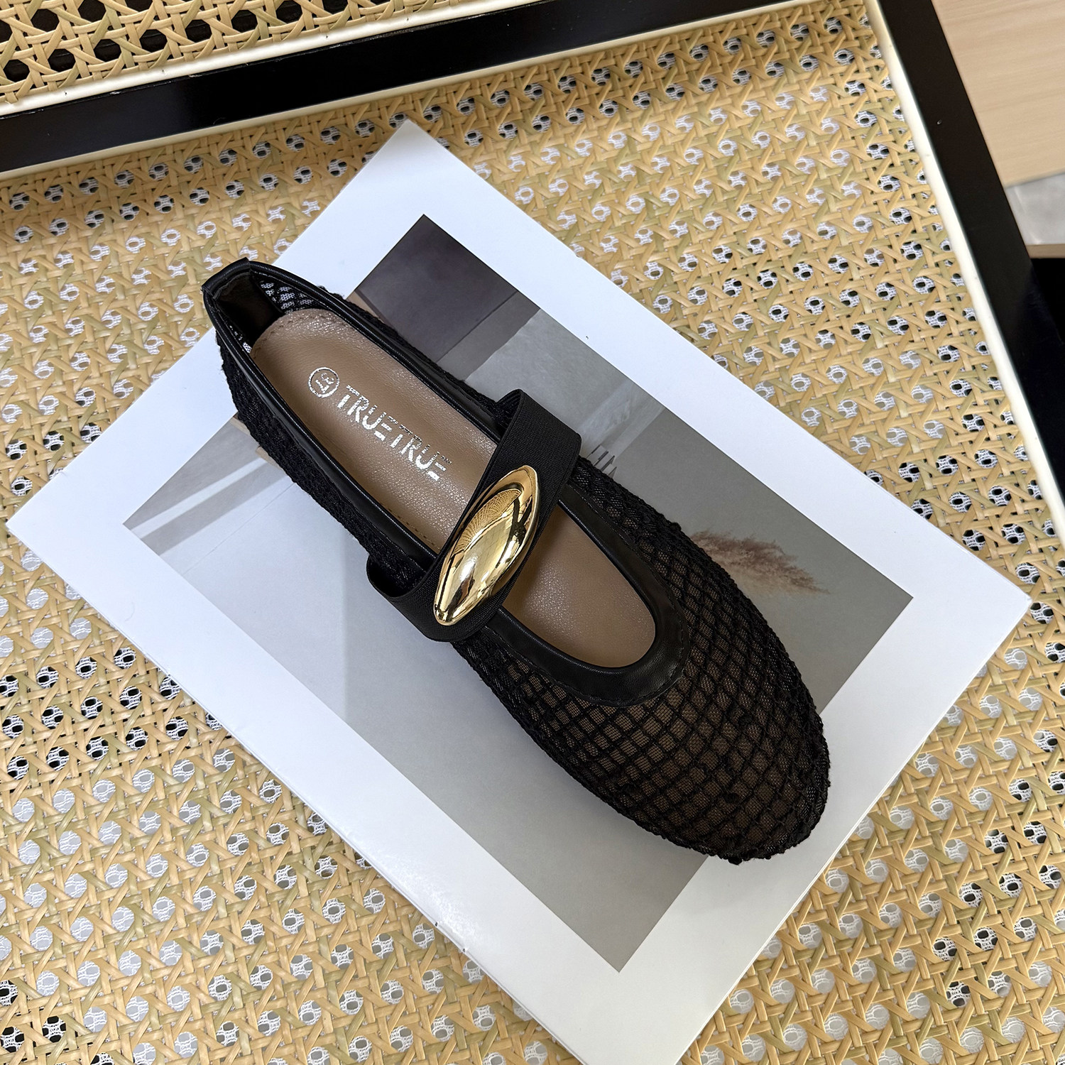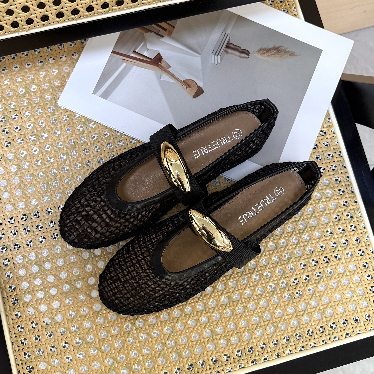 25春季新款 网纱镂空平底玛丽珍单鞋外贸浅口渔网金属扣大码女鞋