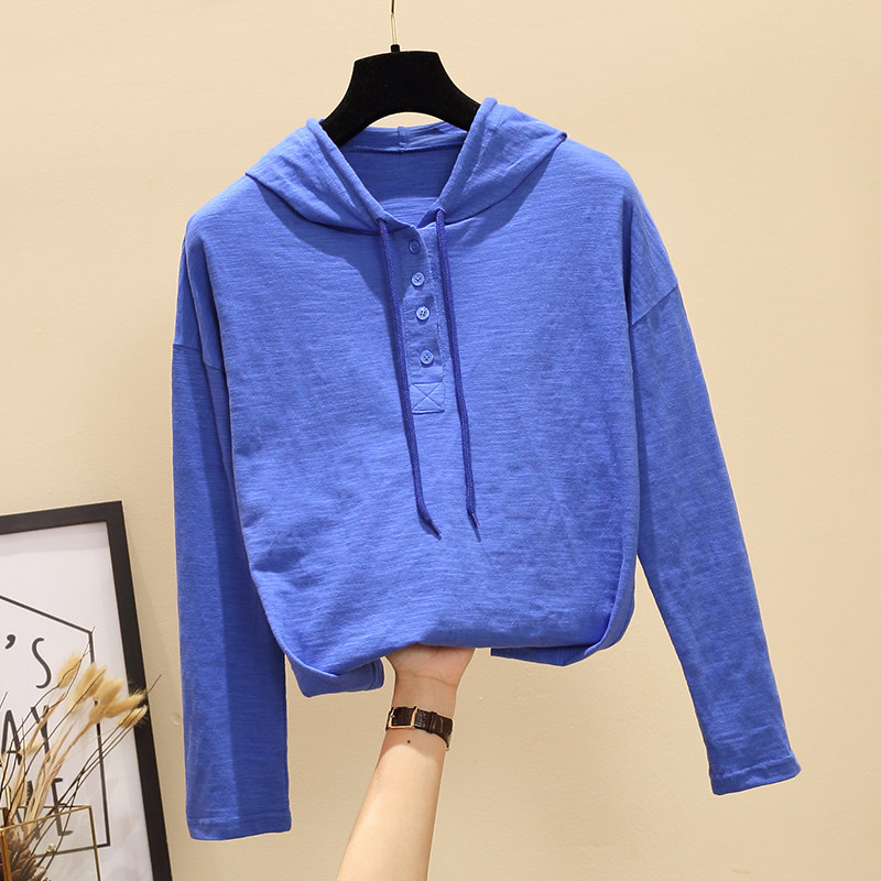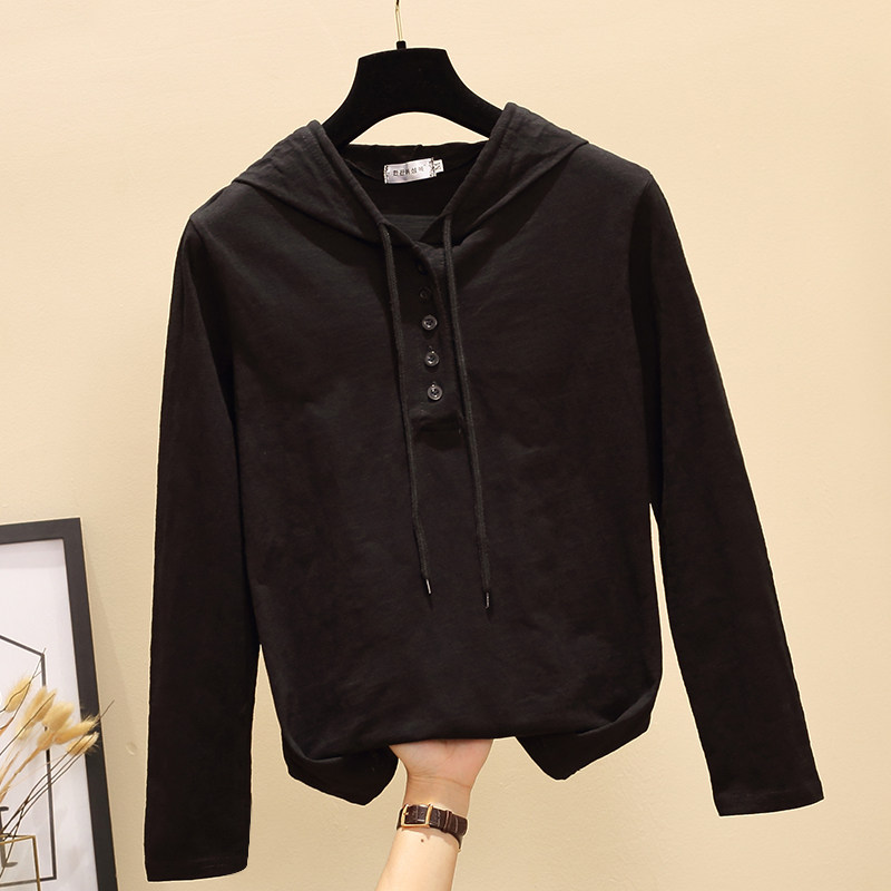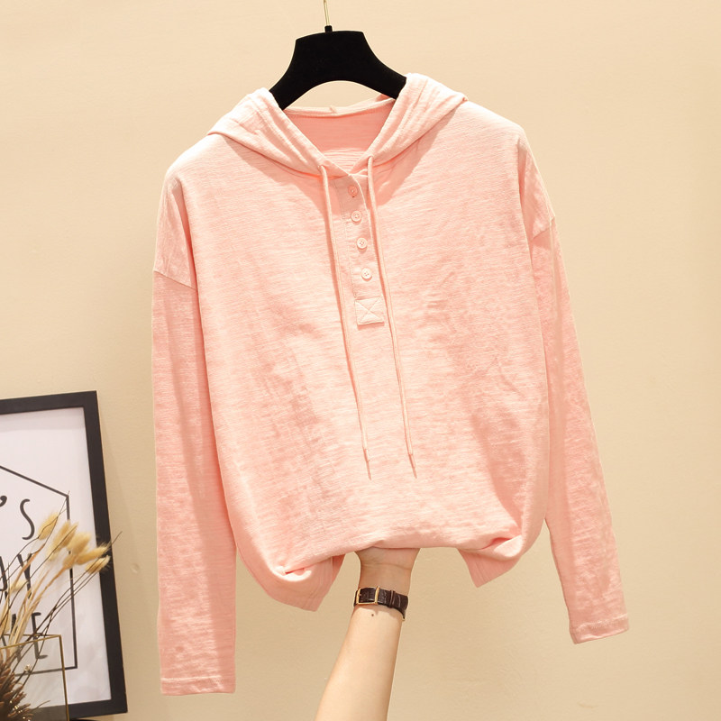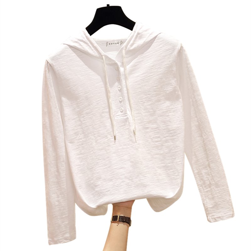 白色竹节棉长袖t恤女装2025年秋装新款v领宽松韩版连帽打底衫上衣