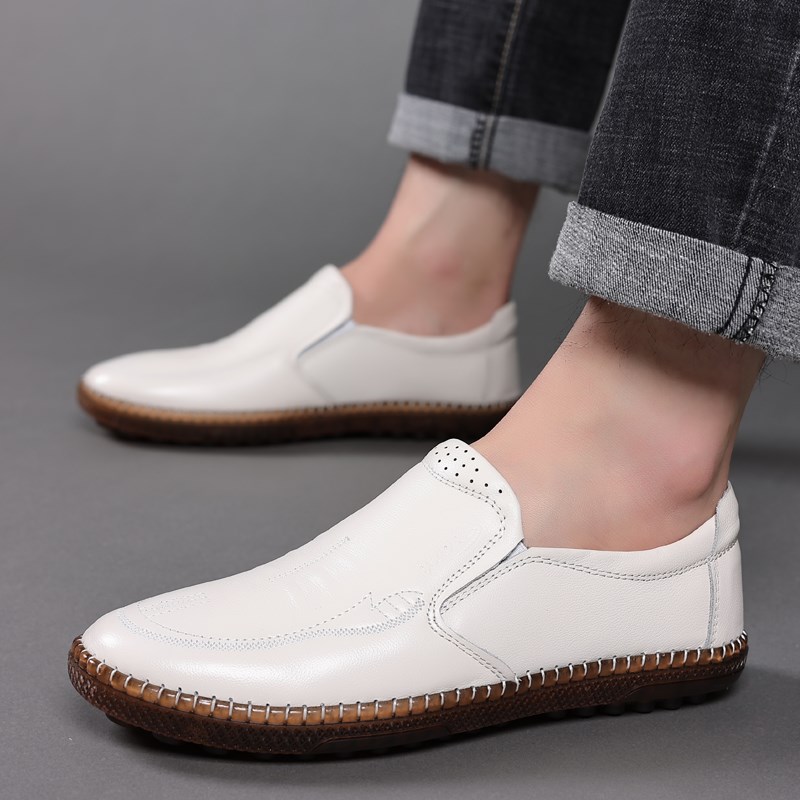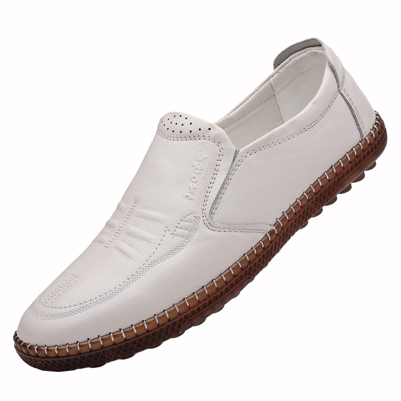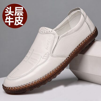 夏天米白色男鞋休闲男士防滑软皮鞋一脚蹬透气豆豆鞋子牛筋底