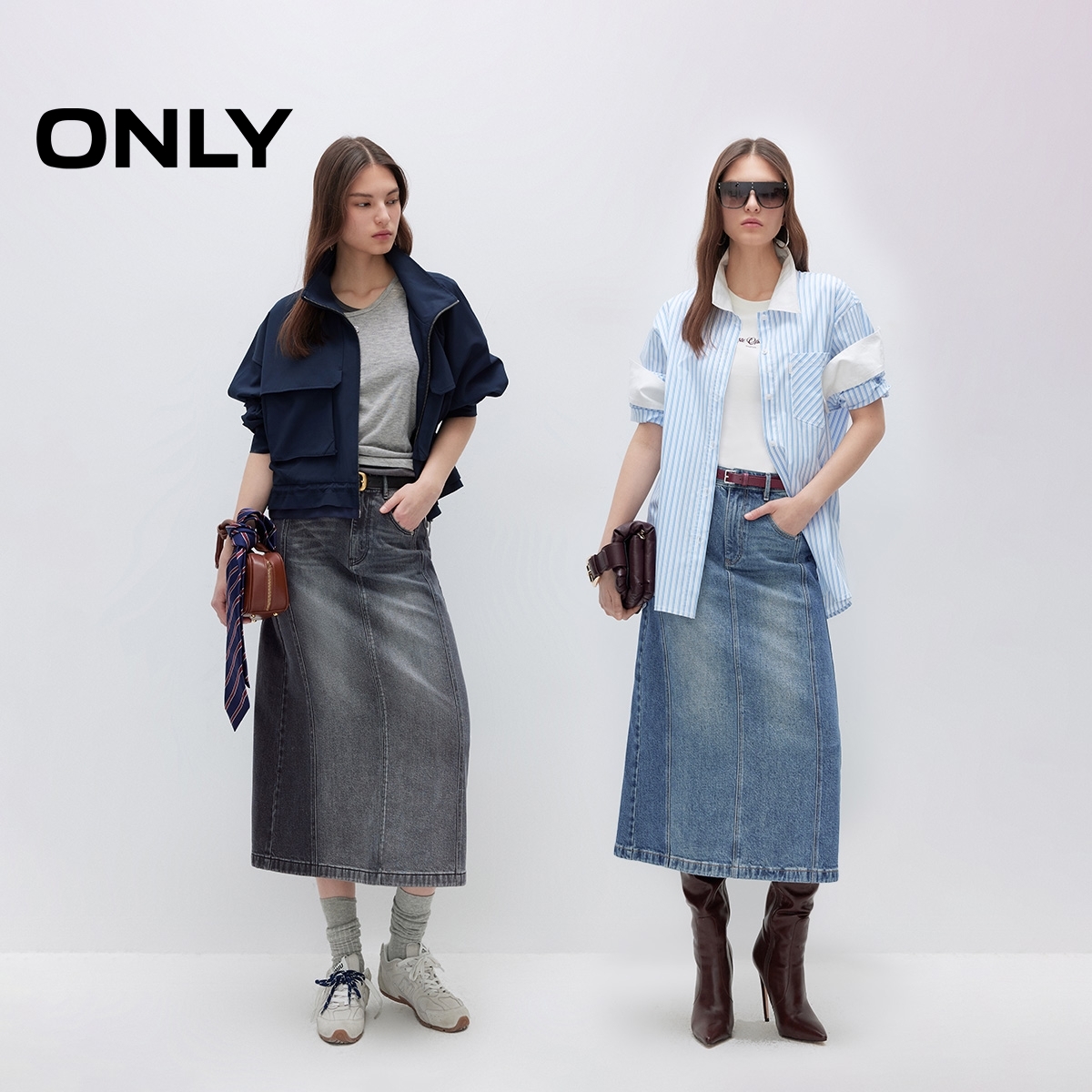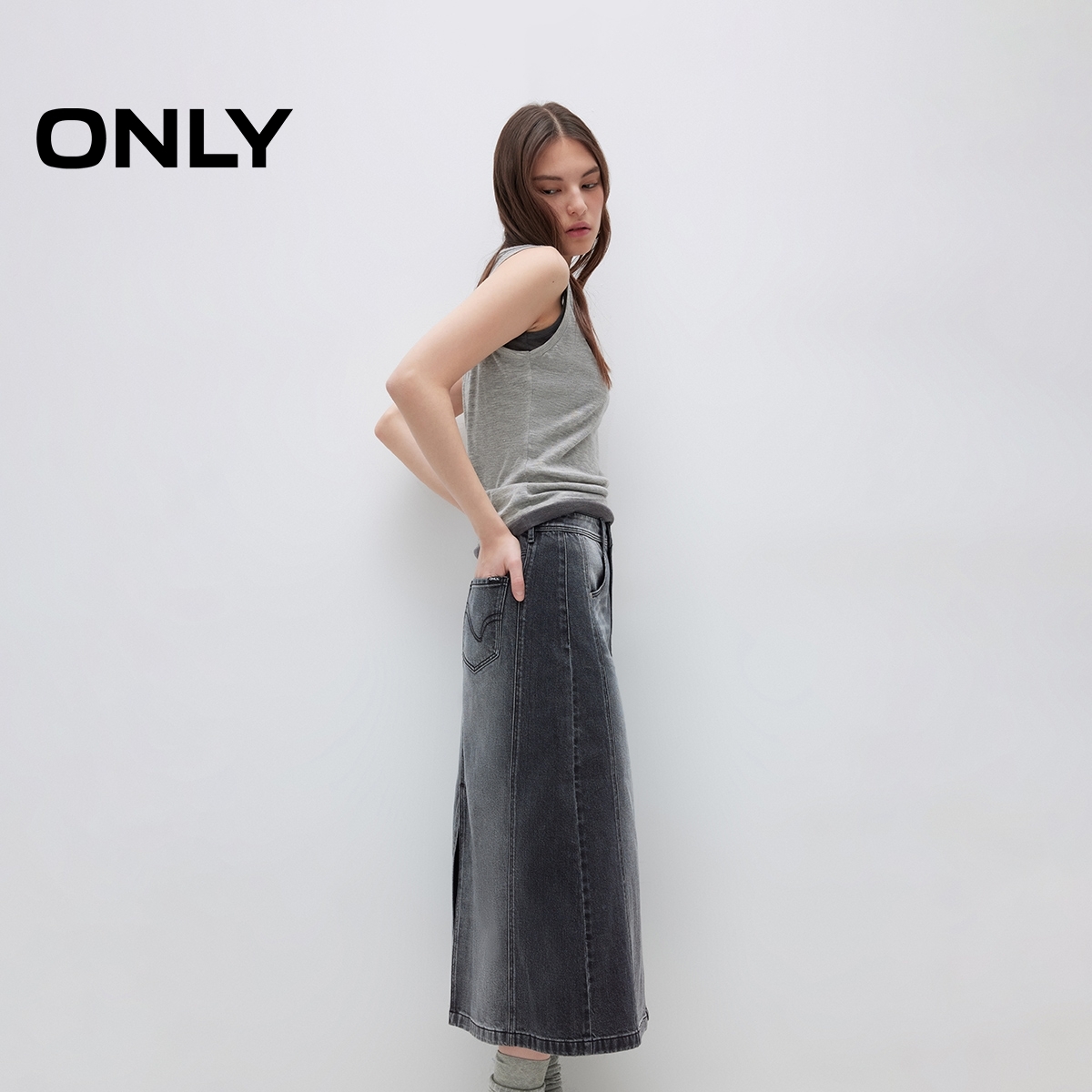 ONLY水洗高腰中长裙牛仔半身裙