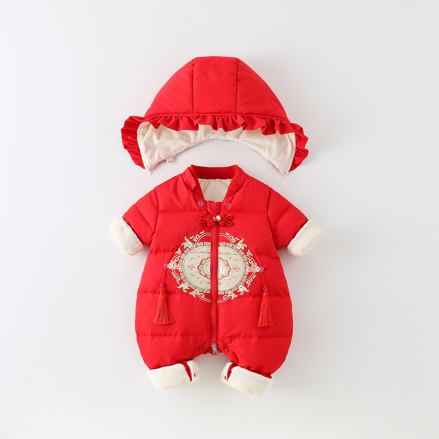 婴儿年服冬装新生儿宝宝羽绒服连体衣红色喜庆拜年服周岁礼服哈衣