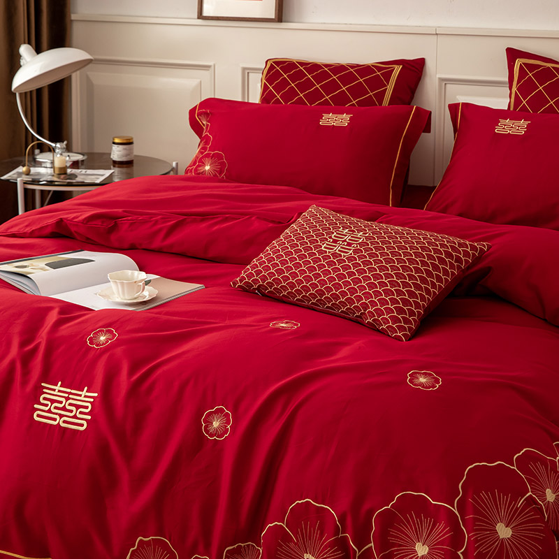 韩式风婚庆60支长绒棉四件套浪漫花朵喜刺绣大红被套床上用品