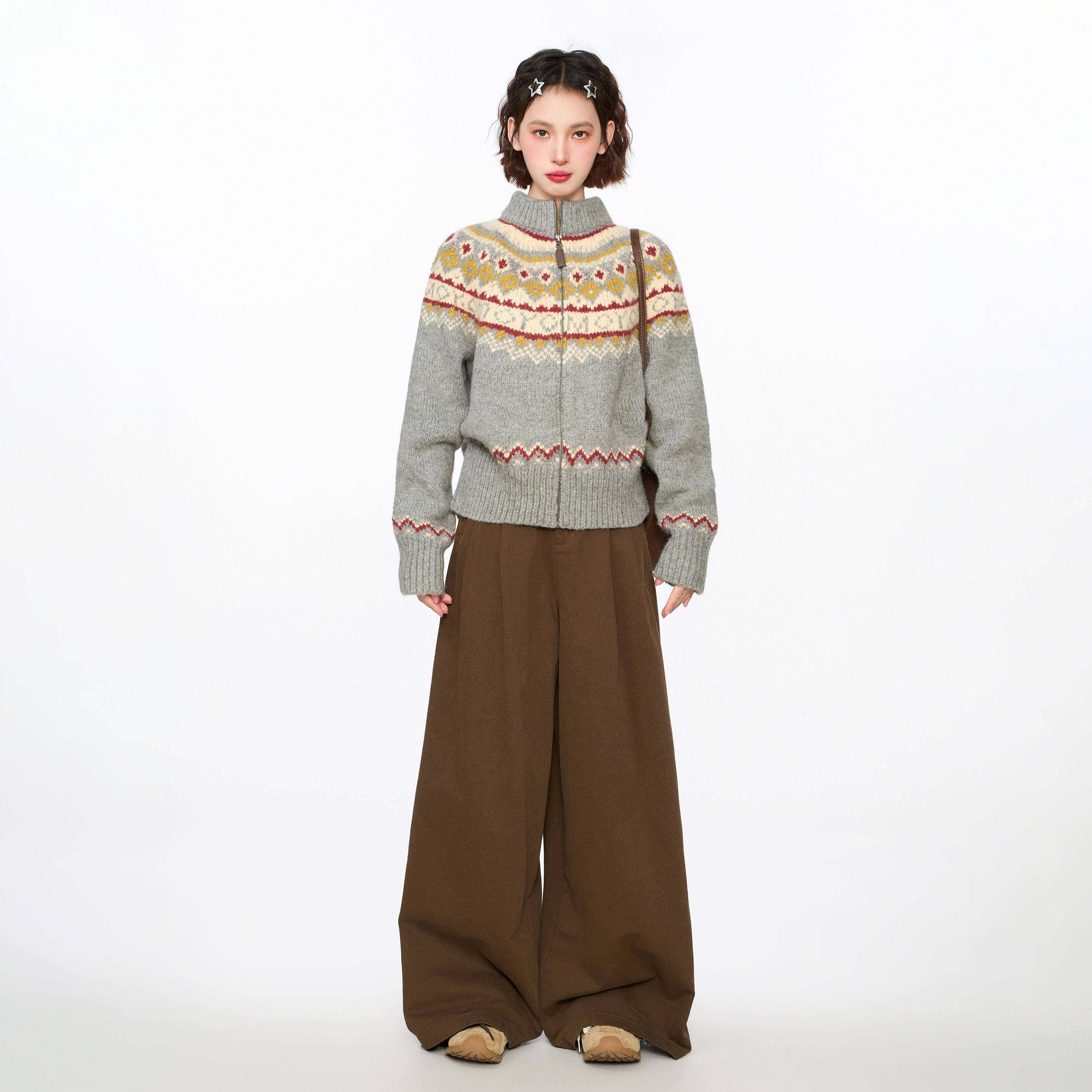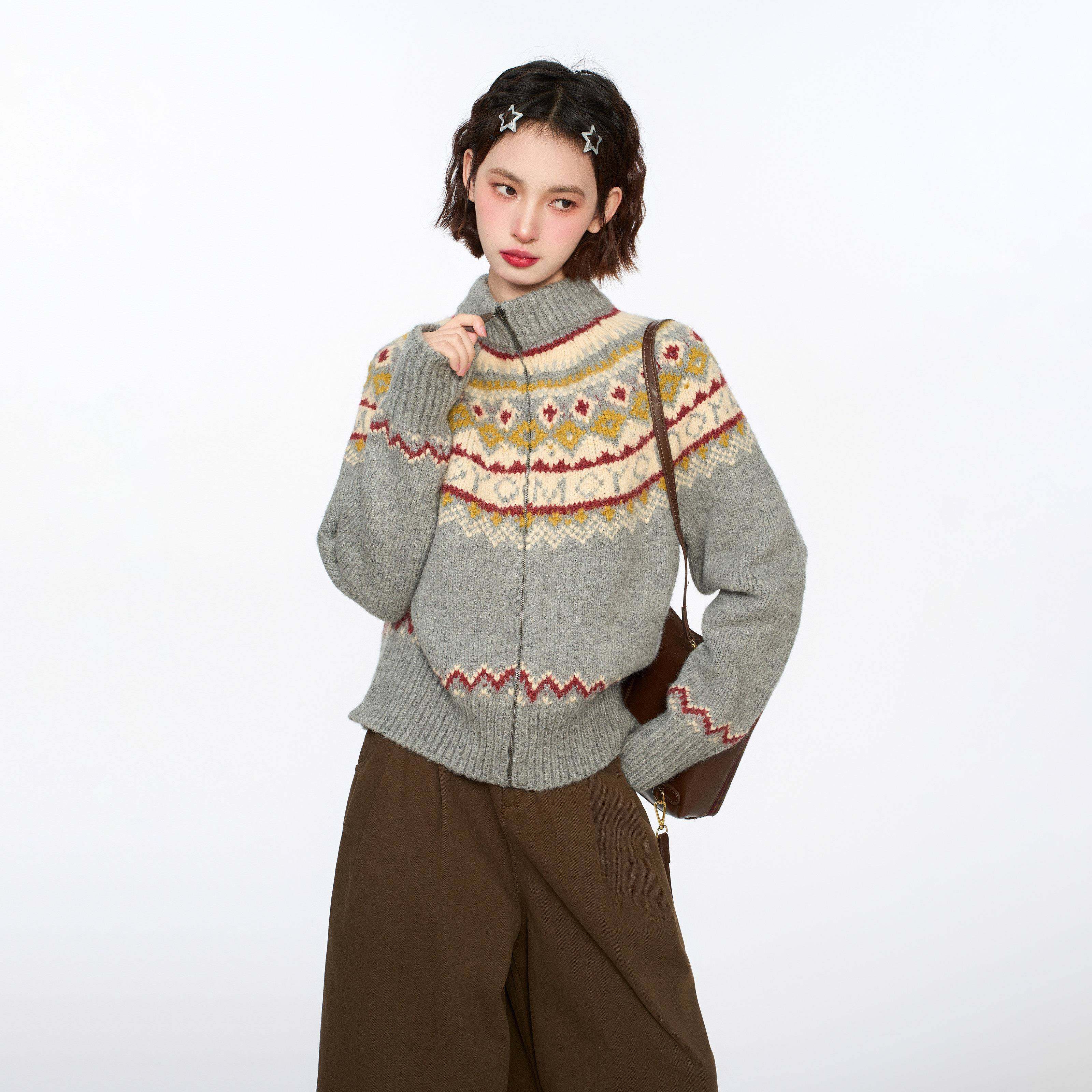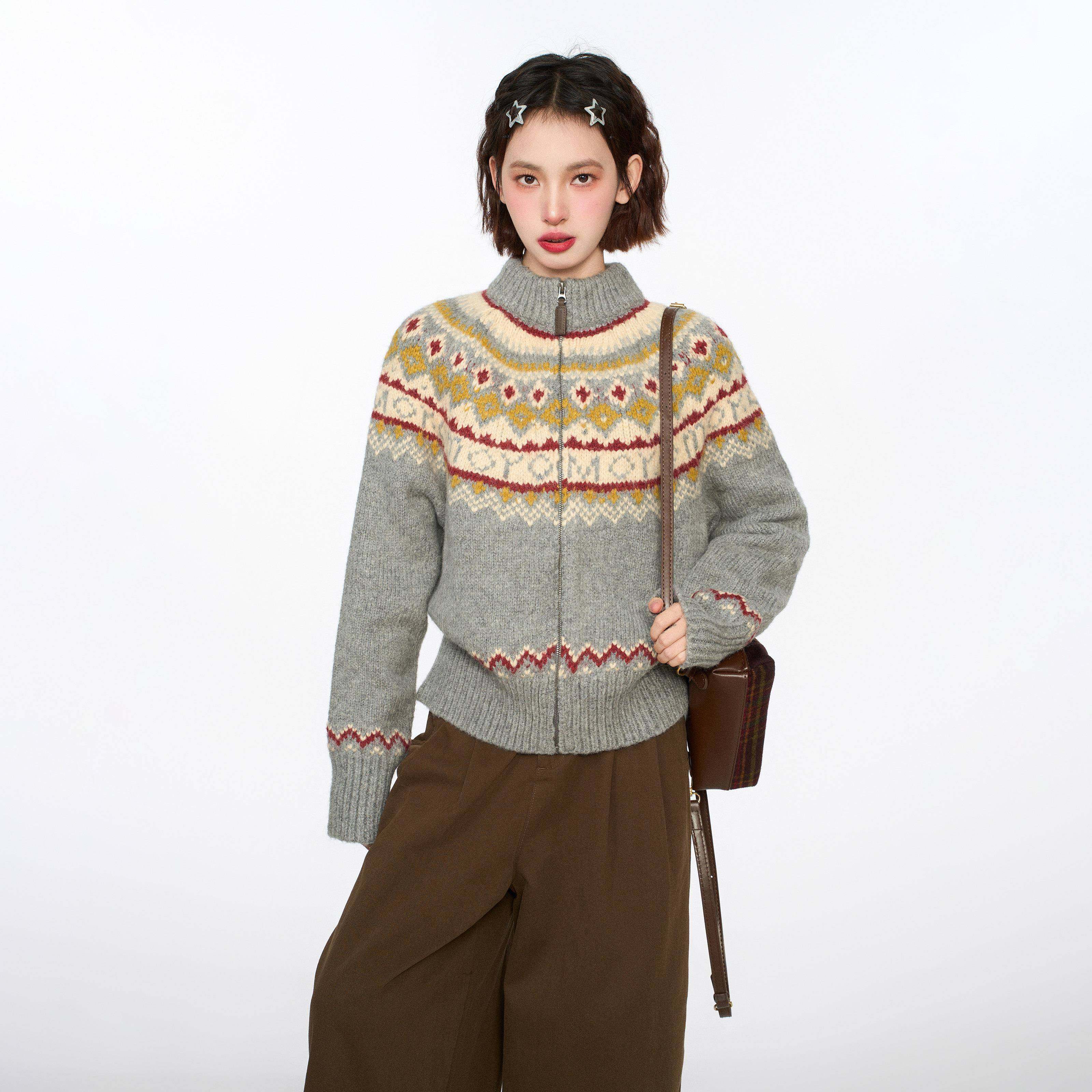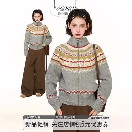 灰色费尔岛高领拉炼毛衣开衫女早秋季慵懒覆古立领针织衫外套秋冬