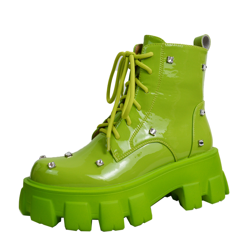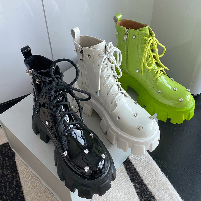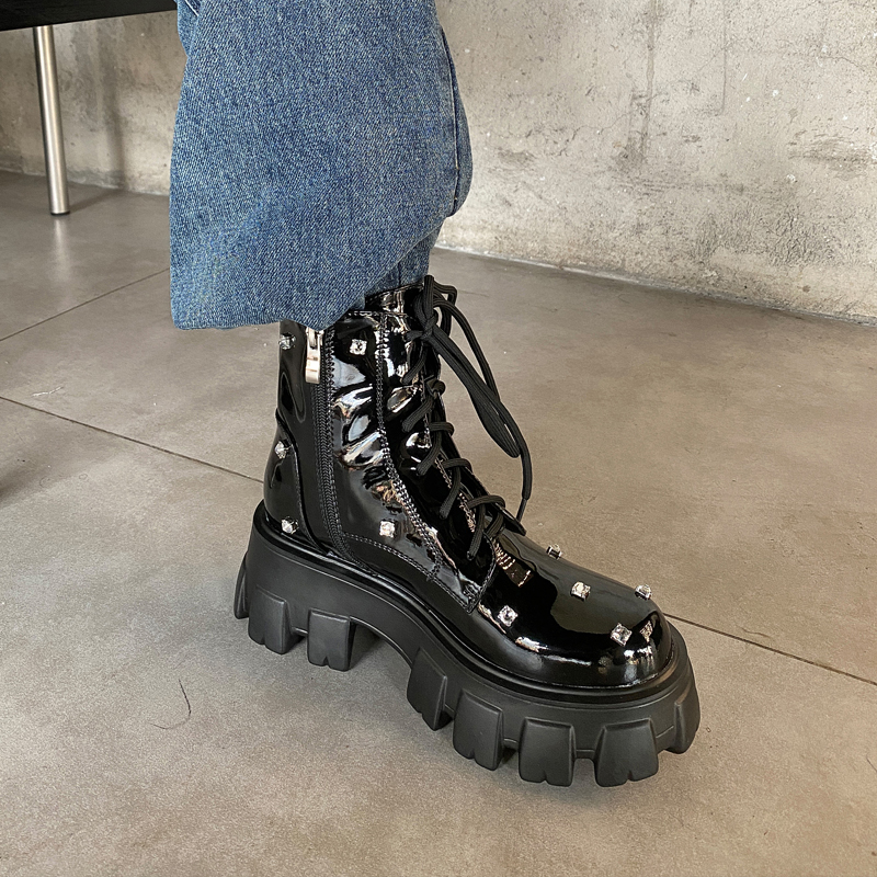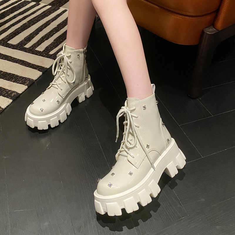 松糕厚底增高马丁靴女春秋新款系带英伦短靴水钻圆头瘦瘦薄款单靴