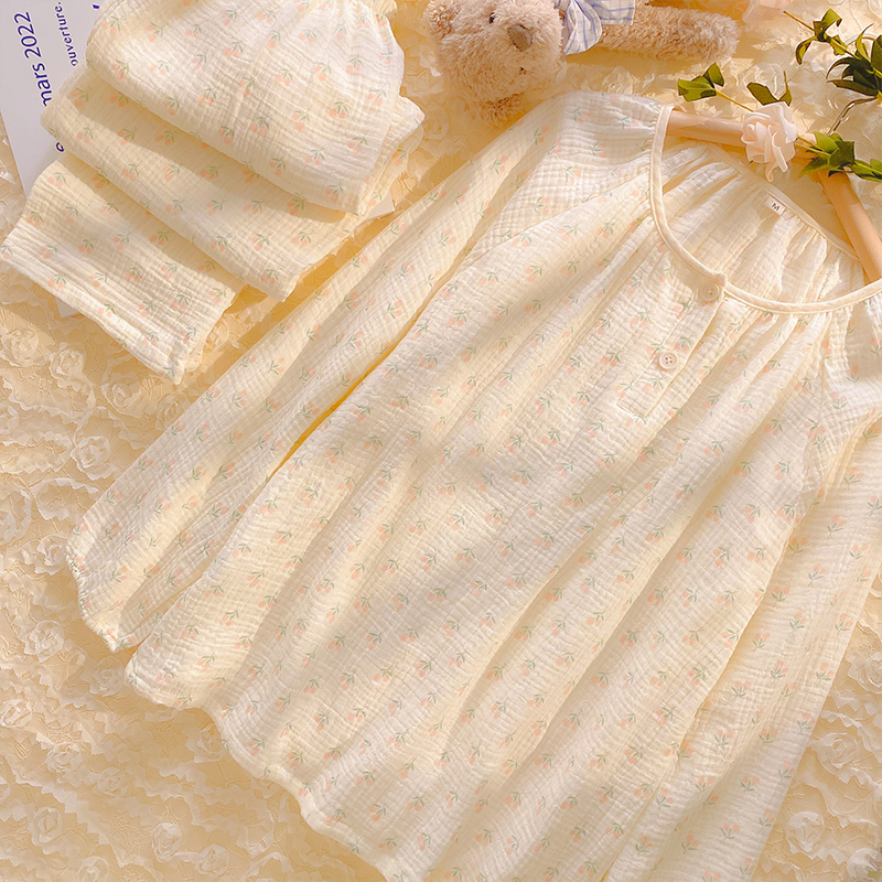圆领棉纱睡衣女款春秋纯棉长袖套装小碎花甜美双层纱布宽松家居服