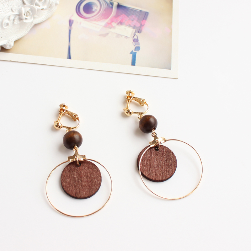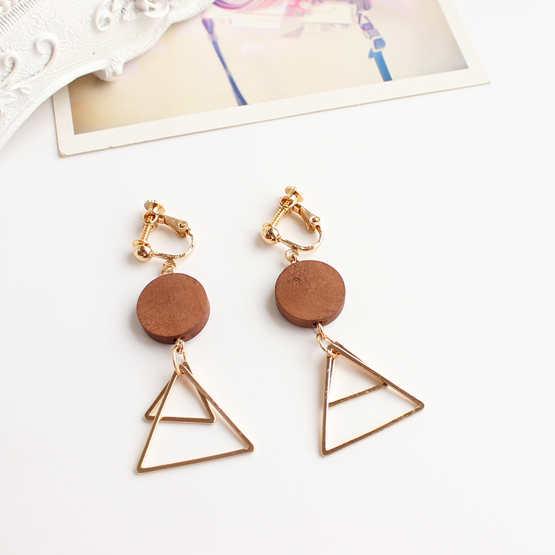 韩版复古风天然木头木片几何三角圆形耳坠长款耳环无耳洞耳夹耳饰