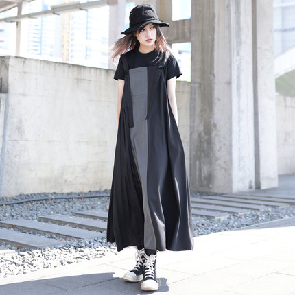 夏季薄款黑灰拼接长款背带裙
