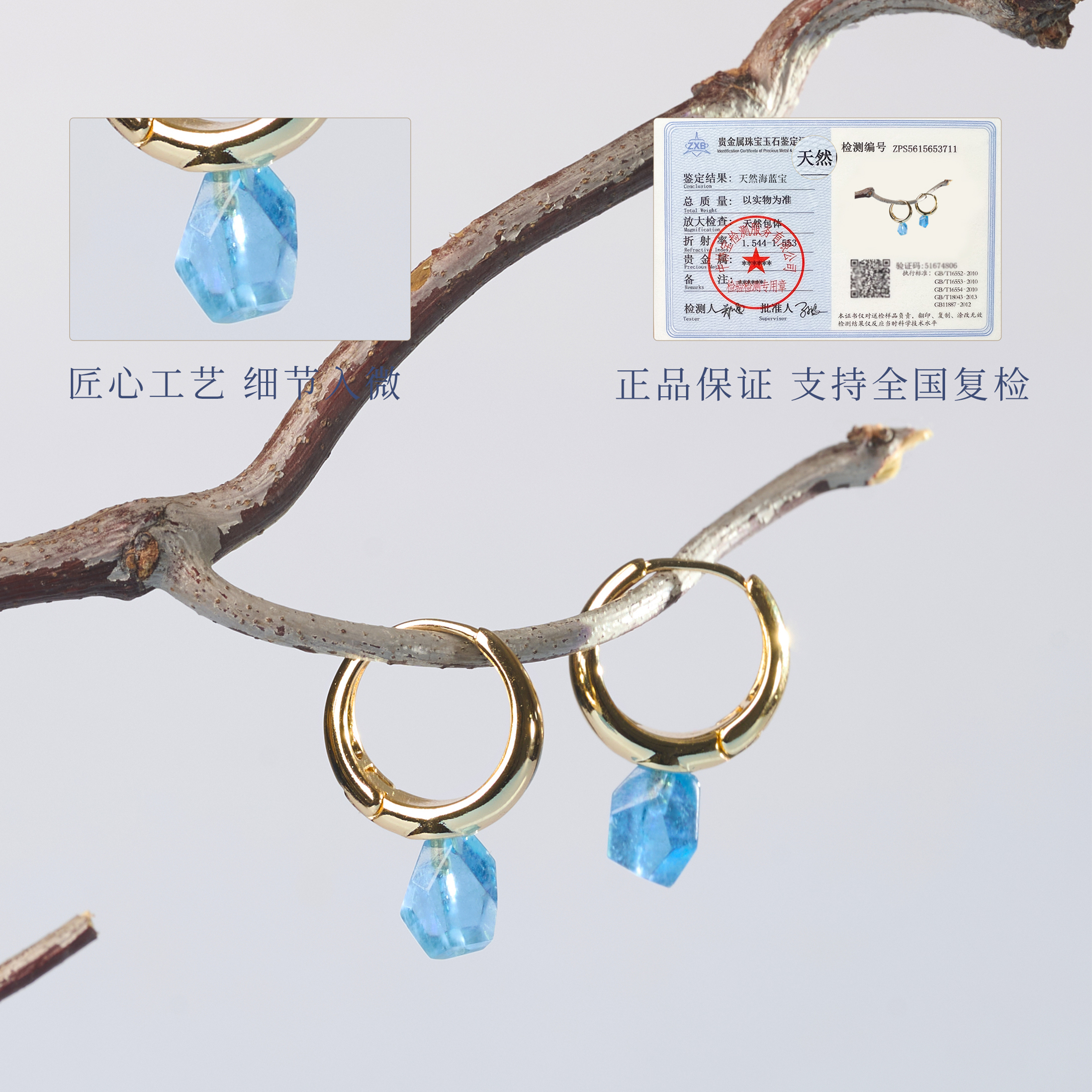 天然海蓝宝耳钉女款送女友