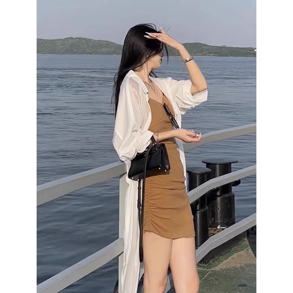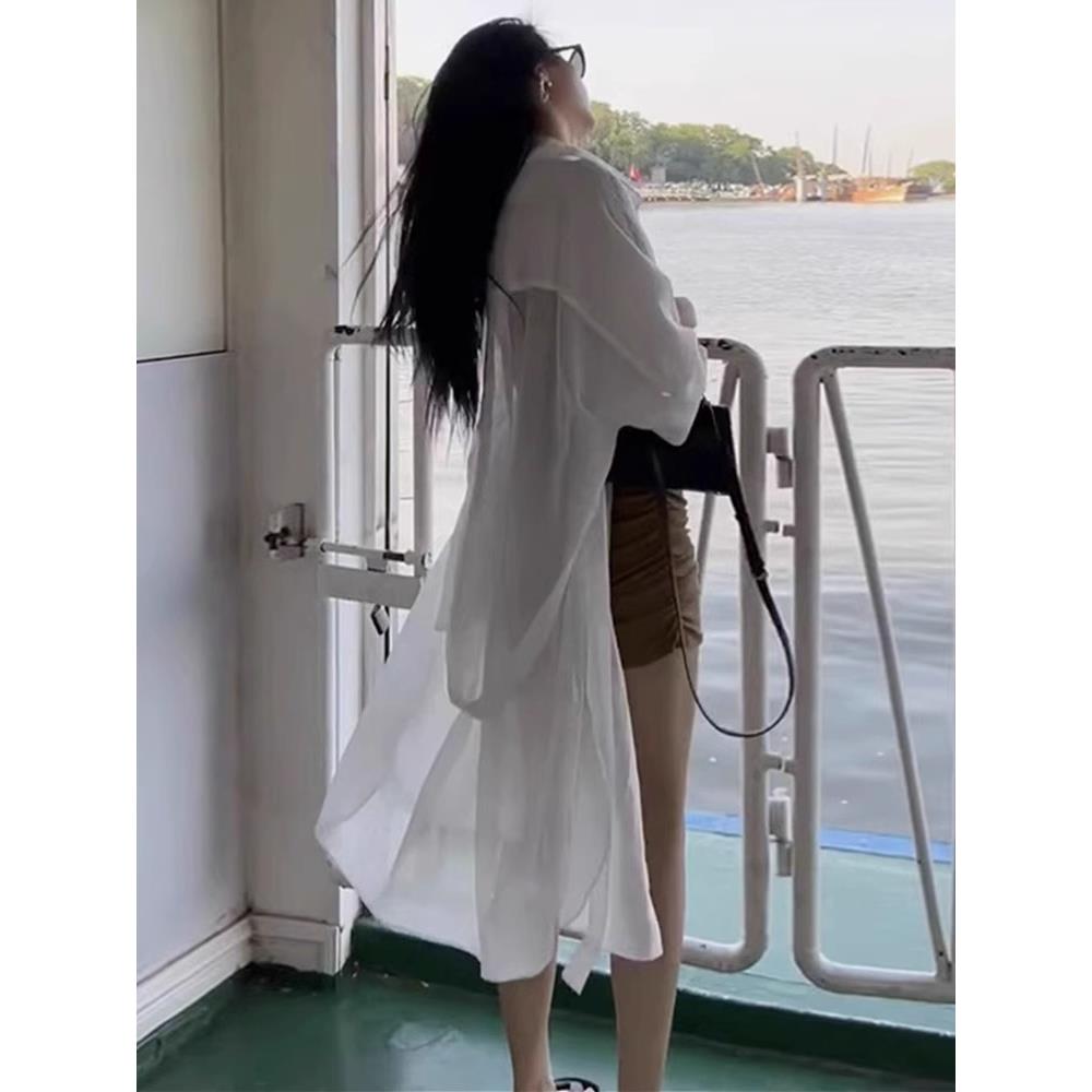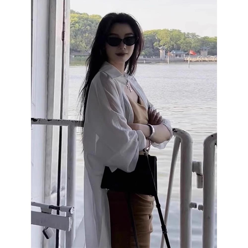 白色冰丝防晒衣女秋季薄款宽松外搭配吊带裙雪纺开衫长款衬衫外套