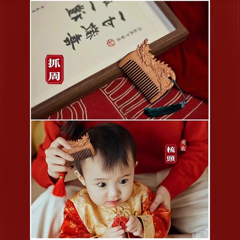 小桃木梳子新生儿宝宝婴儿百天满月生肖龙百日宴梳头仪式周岁