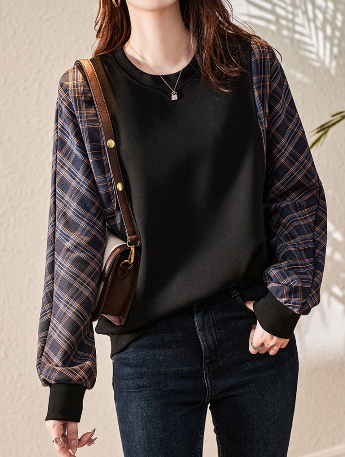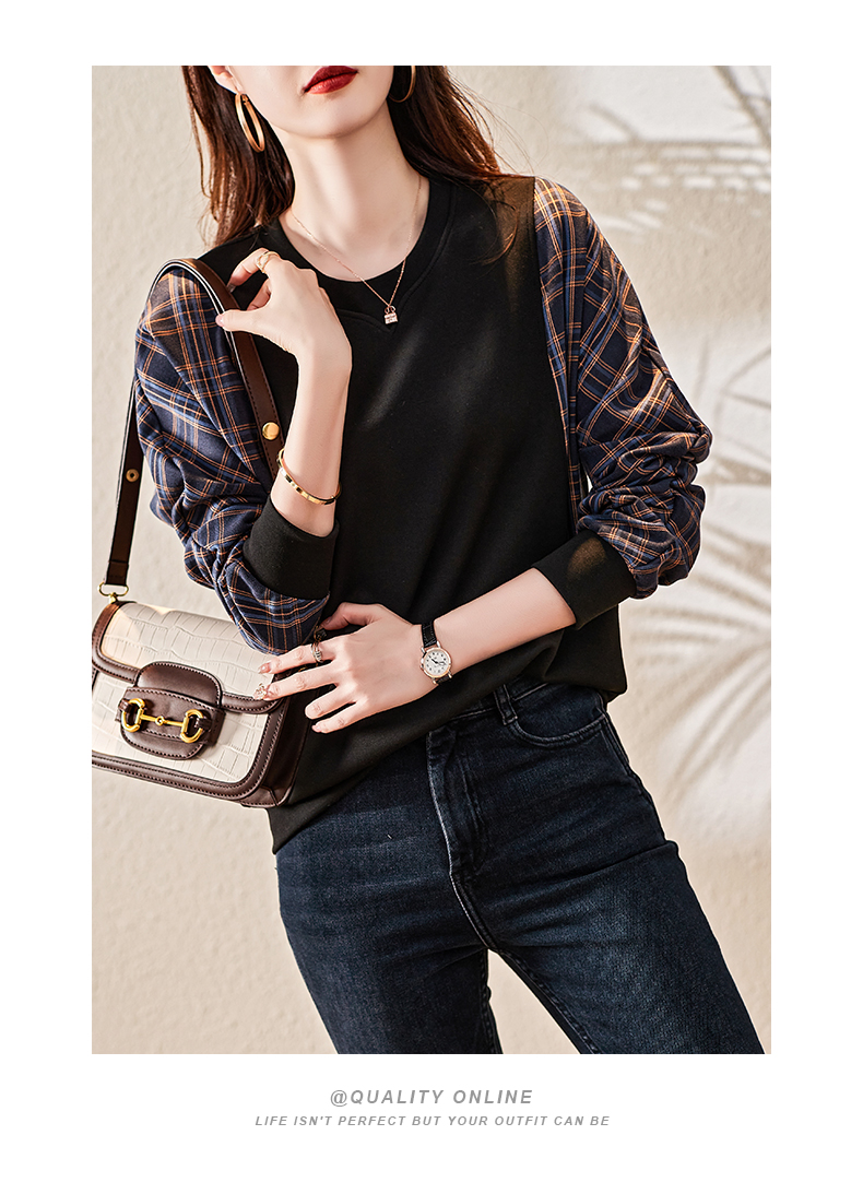 欧货黑色圆领卫衣女2021年早秋新款宽松拼接设计感小众减龄上衣女