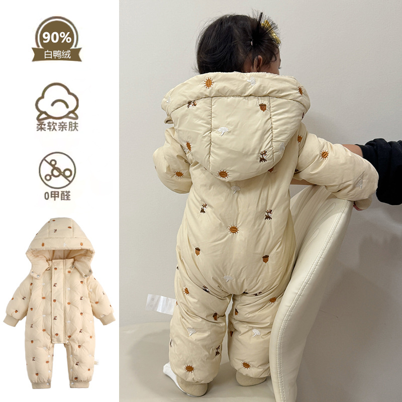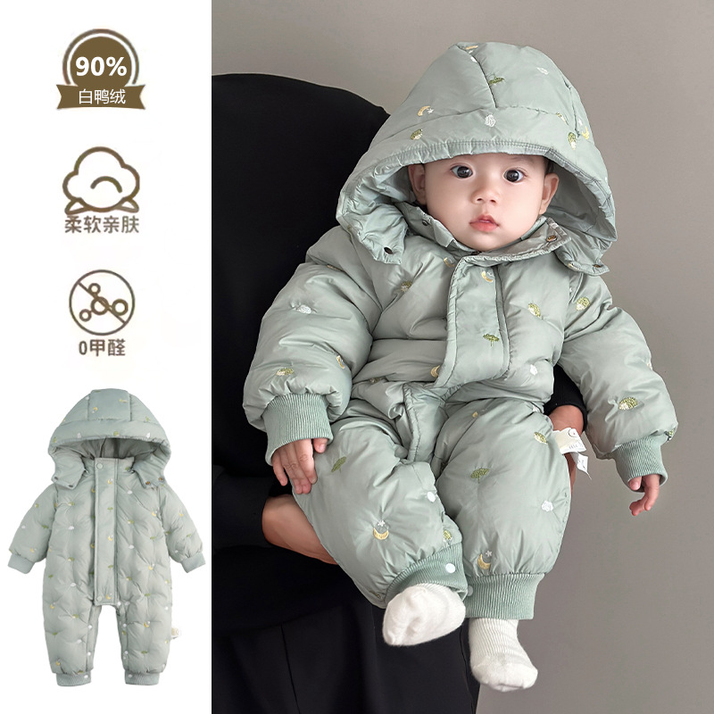 婴幼儿连体羽绒服秋冬加厚外出保暖白鸭绒连体服男女宝宝抱衣爬服