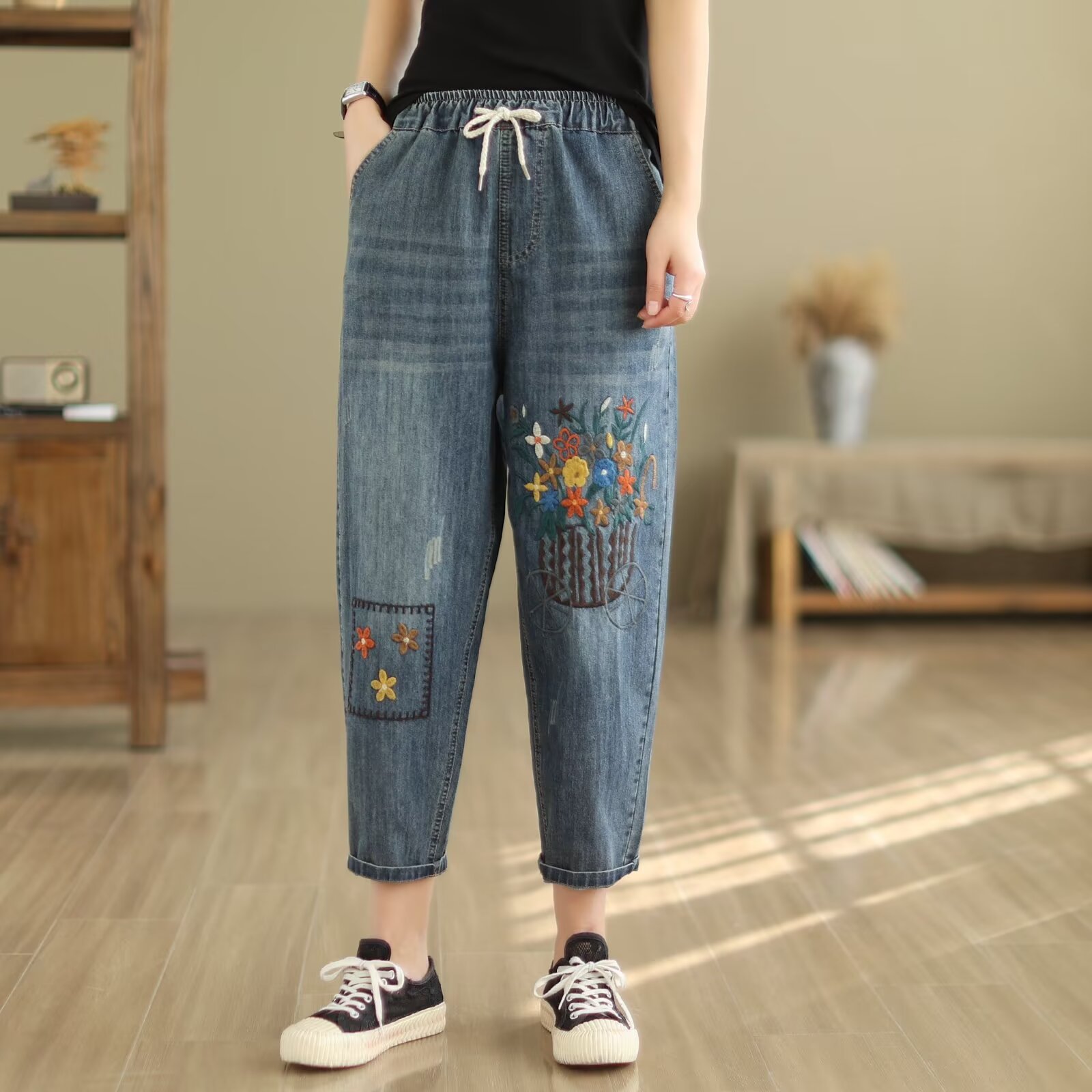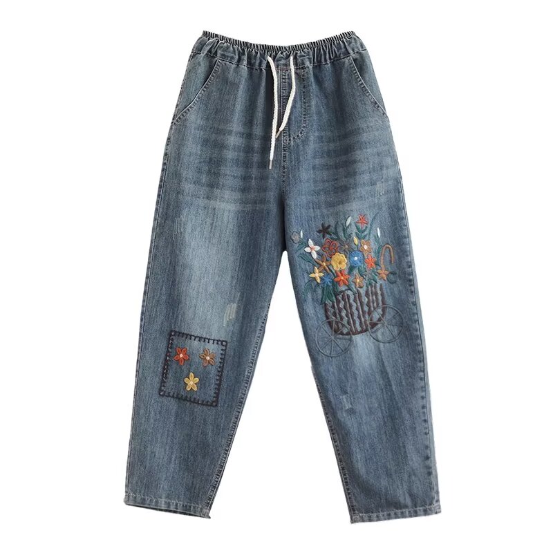 夏季薄款七分牛仔裤女韩版休闲宽松绣花高腰八分裤百搭显瘦哈伦裤