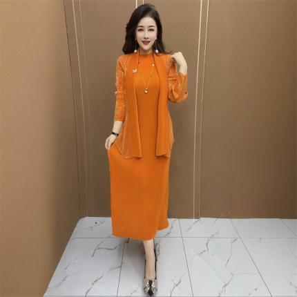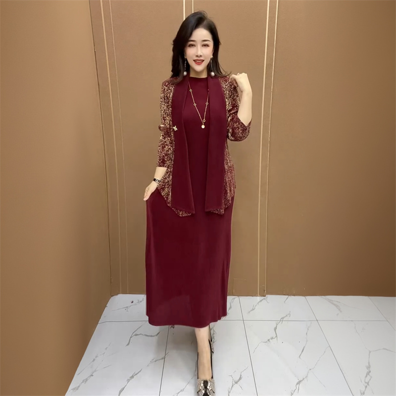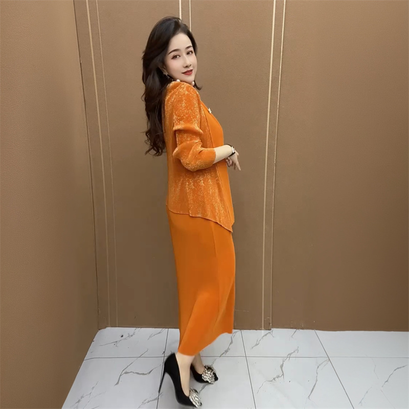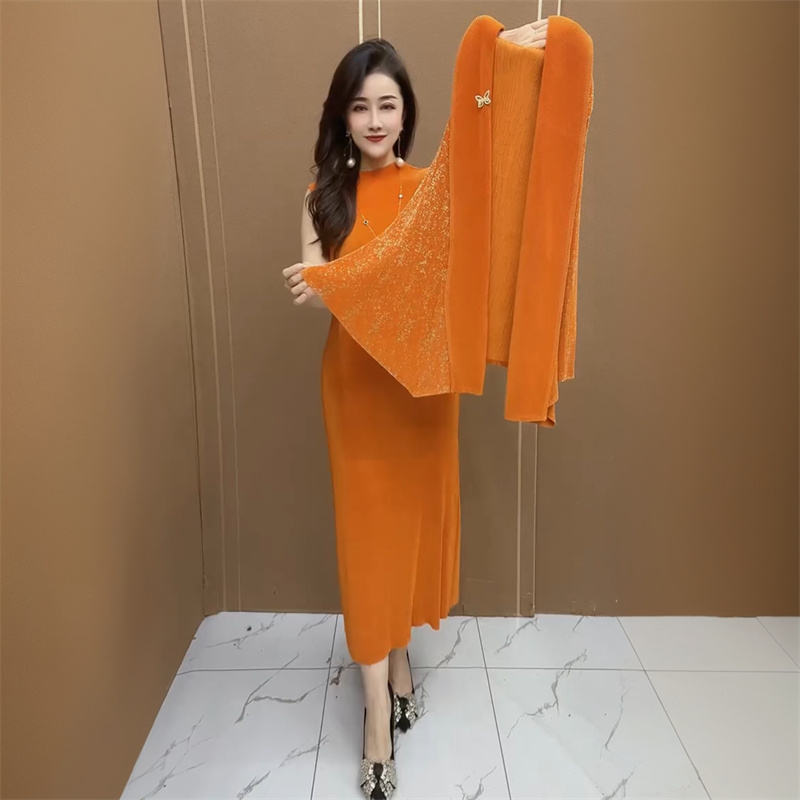 三宅褶皱套装2025春秋新款洋气外套内搭气质长款连衣裙大码两件套