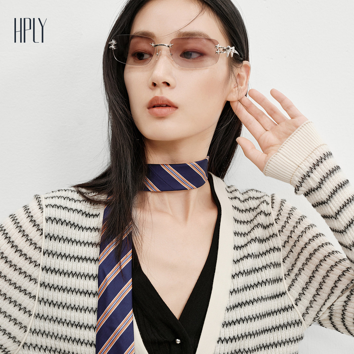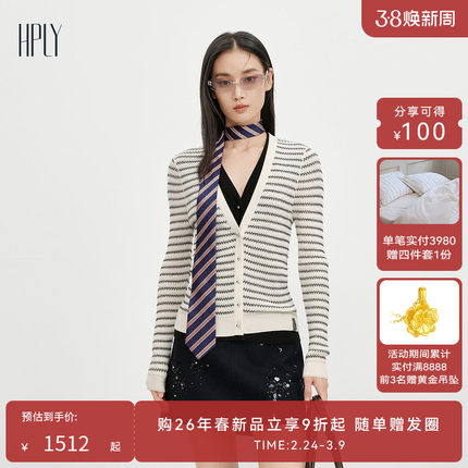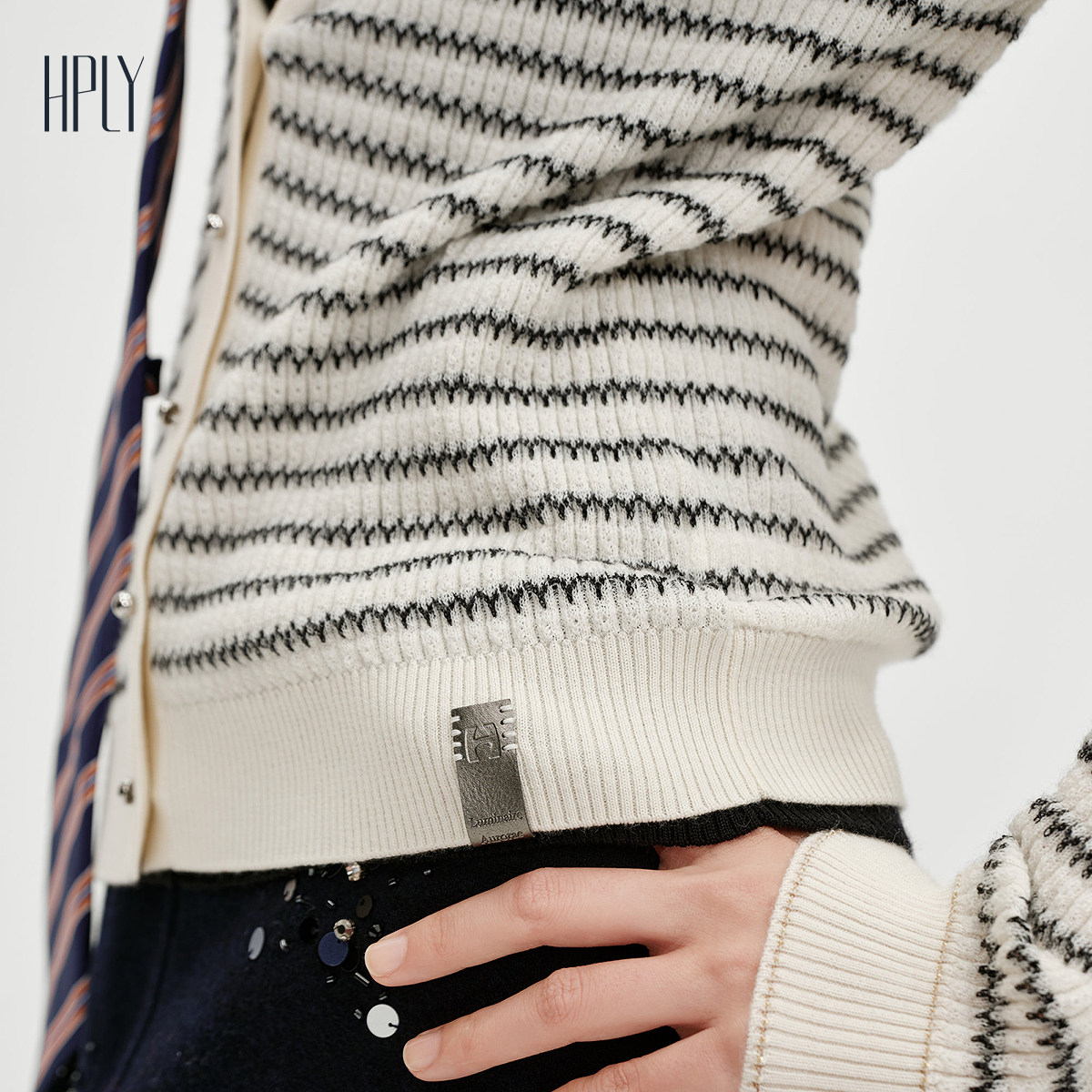 【商场同款】HPLY荷比俪25冬新款绵羊毛V领条纹假两件套撞色毛衫