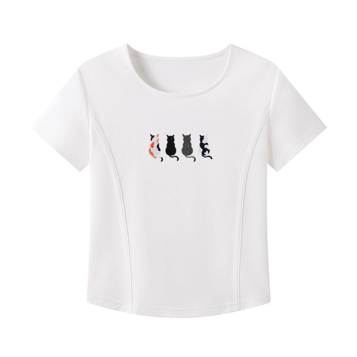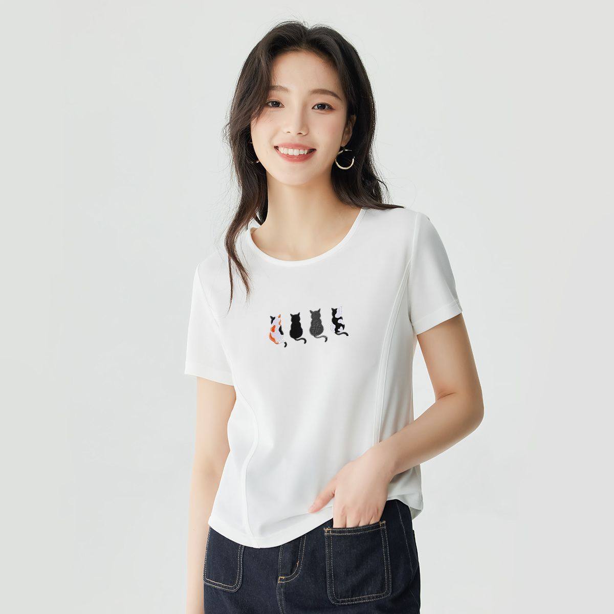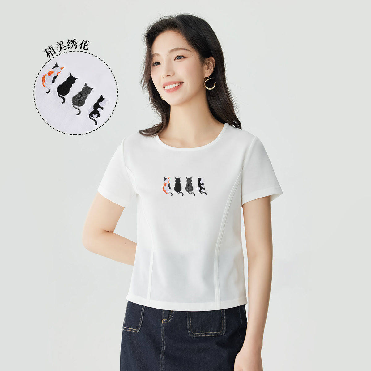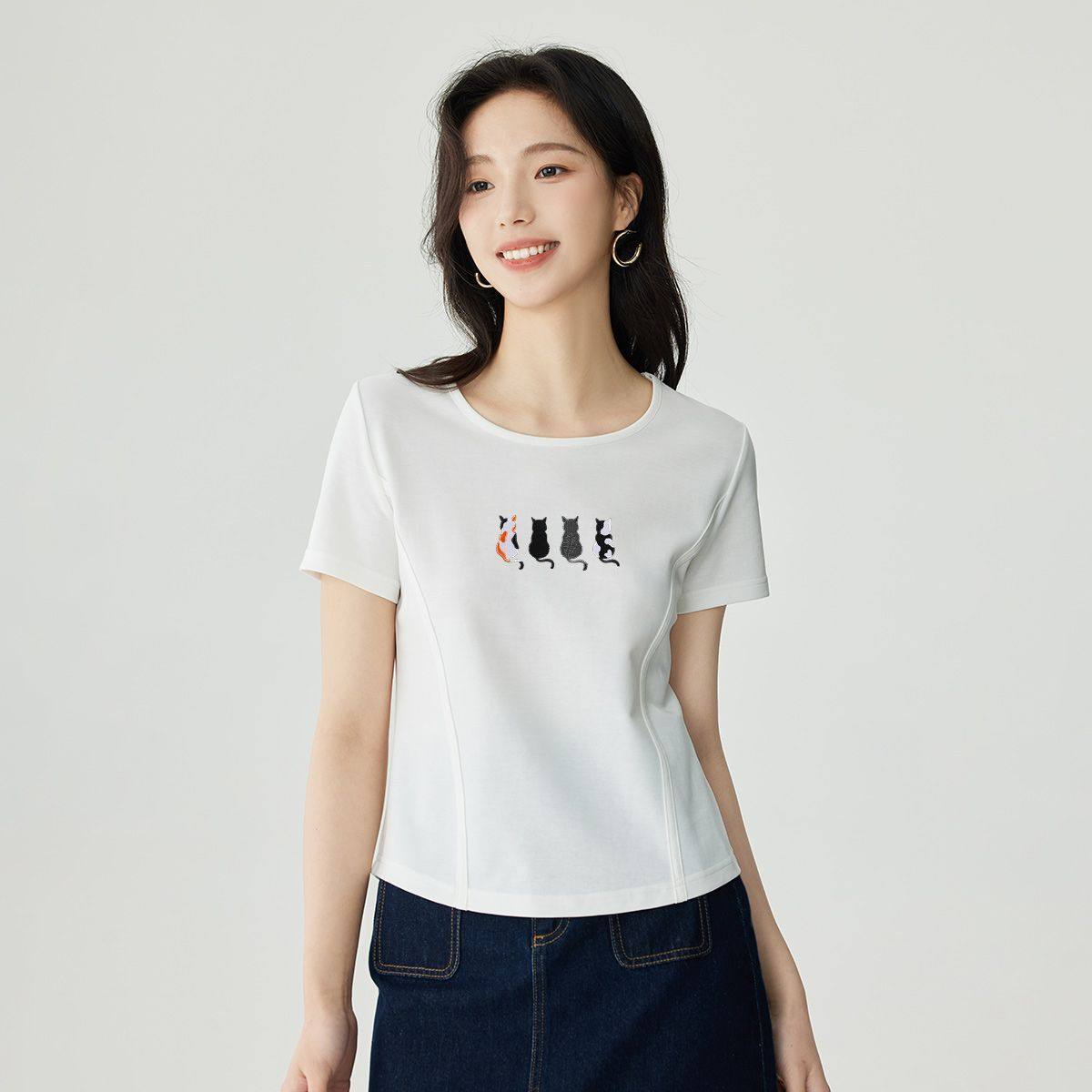 茵曼拼接线收腰设计感圆领短袖女25年夏季清新休闲百搭正肩T恤女