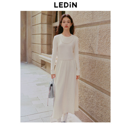 【反季清仓】乐町假两件拼接连衣裙女白色简约打底裙磨毛蕾丝长裙