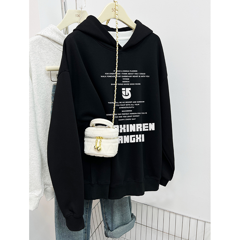 黄色字母印花连帽卫衣女秋冬新款加绒加厚胖MM宽松大码中长款外套