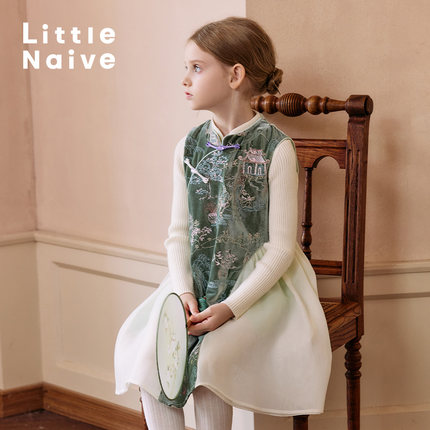 LittleNaive 女童中式旗袍春秋刺绣中国风背心裙儿童新中式连衣裙