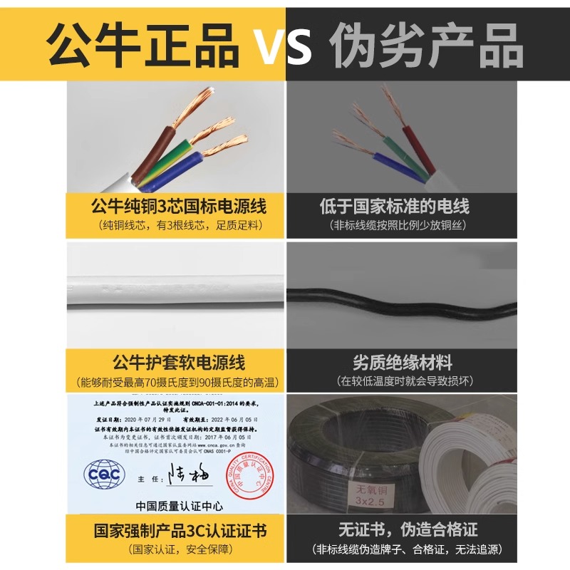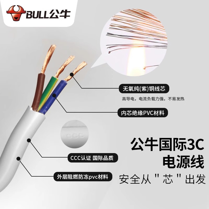 公牛电线2芯3芯家用软线纯铜芯国标护套0.75/1/1.5平方rvv电缆线