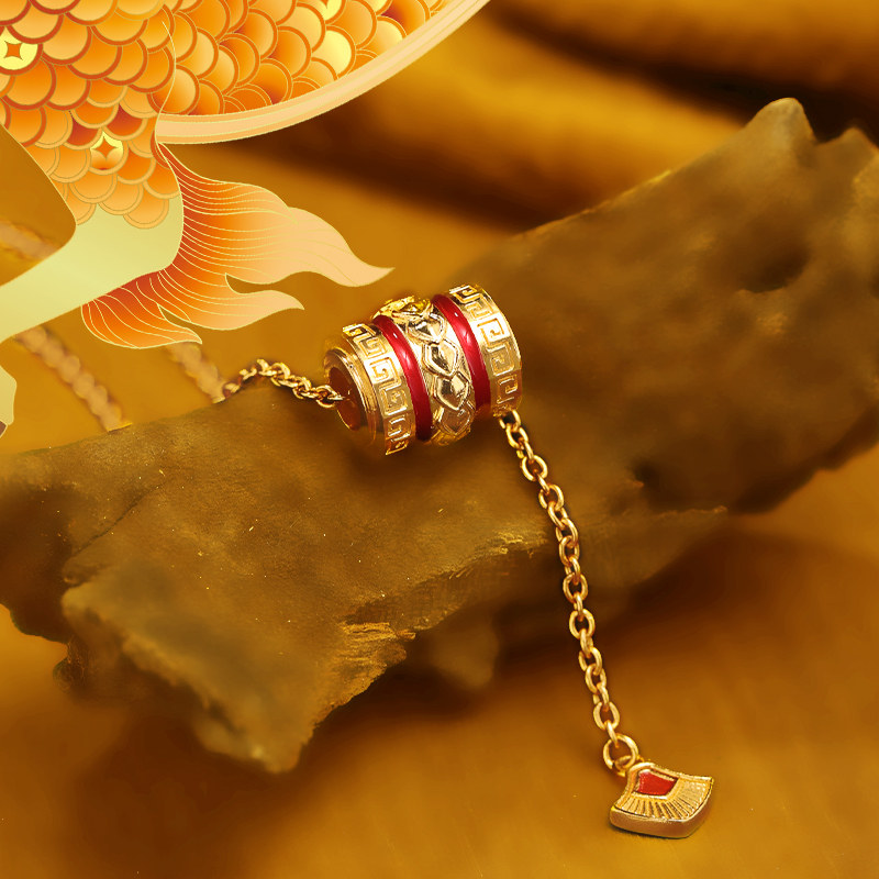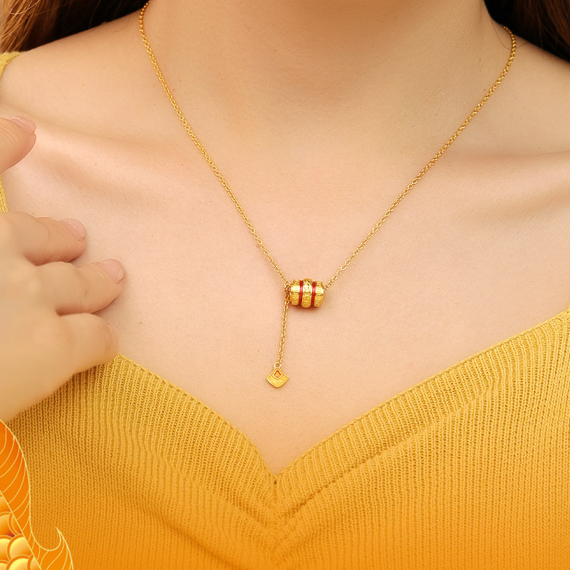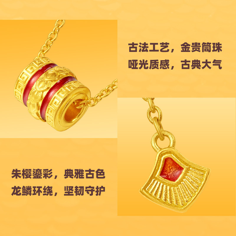 老庙黄金足金999古法富富有余红鎏彩龙鳞筒珠Y字项链守护黄金甲
